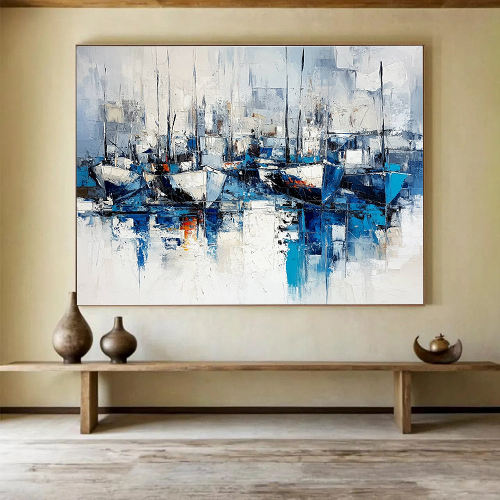 The artist was inspired by the quiet charm of a harbor. They used layered brushstrokes in blue and white to create the boats and their reflections, capturing the essence of maritime life. It's perfect for a nautical - themed restaurant to bring in the sea - side vibe or a coastal home to celebrate the beauty of the harbor.Handmade Acrylic/oil painting on canvas, Unframed/Not stretched. Packing: Rolled and shipped in a solid tube. The painting come with EXTRA 2-3 inch white border around for stretching or framing. Delivery time: You will receive the painting around 7-12 days( 3-5 days to finish the painting, 5-7 days to your home.by Fedex And Dhl)