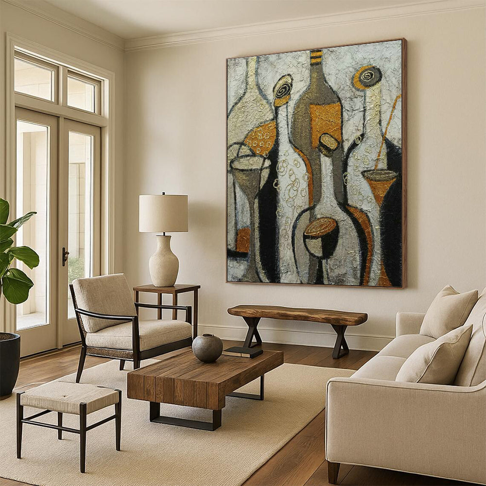 Drawn to the shapes of bottles and glasses, the artist used a textured style to create an abstract still life. The goal was to bring a touch of sophistication and artistry to the subject. Great for a wine cellar to enhance the ambiance or an art - centric dining room to add a unique artistic touch.Handmade Acrylic/oil painting on canvas, Unframed/Not stretched. Packing: Rolled and shipped in a solid tube. The painting come with EXTRA 2-3 inch white border around for stretching or framing. Delivery time: You will receive the painting around 7-12 days( 3-5 days to finish the painting, 5-7 days to your home.by Fedex And Dhl)