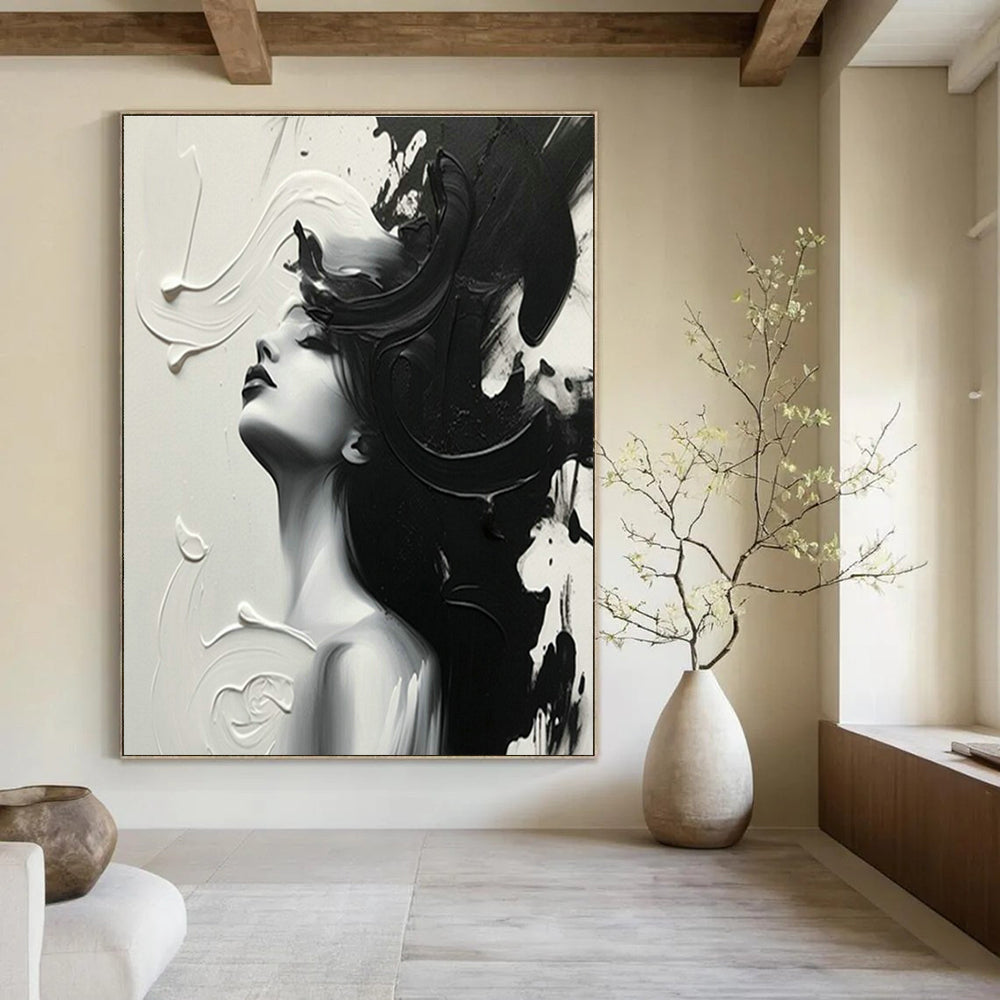 Swirling monochrome strokes create a mysterious, avant - garde portrait. In a contemporary art gallery, showcasing boundary - pushing works, it’s a conversation starter. Art buffs debate the emotions behind the abstract features, fueling intellectual exchanges. In an edgy home office, with industrial furniture and minimalist decor, it adds an artistic edge. Freelancers or creatives working here find inspiration in its boldness, turning the office into a space where creativity and attitude collide.Handmade Acrylic/oil painting on canvas, Unframed/Not stretched. Packing: Rolled and shipped in a solid tube. The painting come with EXTRA 2-3 inch white border around for stretching or framing. Delivery time: You will receive the painting around 7-12 days( 3-5 days to finish the painting, 5-7 days to your home.by Fedex And Dhl)