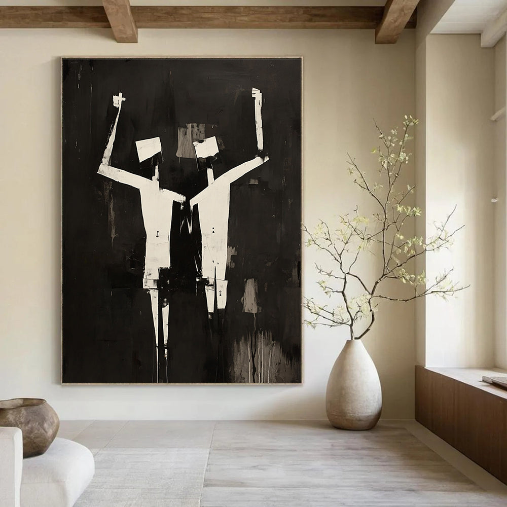 Inspired by street art and themes of movement, the artist painted two abstract figures in black and white. The bold forms and the dynamic poses convey a sense of energy. In an urban art space, it fits the contemporary and edgy vibe, attracting art enthusiasts. In a modern gym, it adds a motivational element, inspiring visitors to stay active.Handmade Acrylic/oil painting on canvas, Unframed/Not stretched. Packing: Rolled and shipped in a solid tube. The painting come with EXTRA 2-3 inch white border around for stretching or framing. Delivery time: You will receive the painting around 7-12 days( 3-5 days to finish the painting, 5-7 days to your home.by Fedex And Dhl)