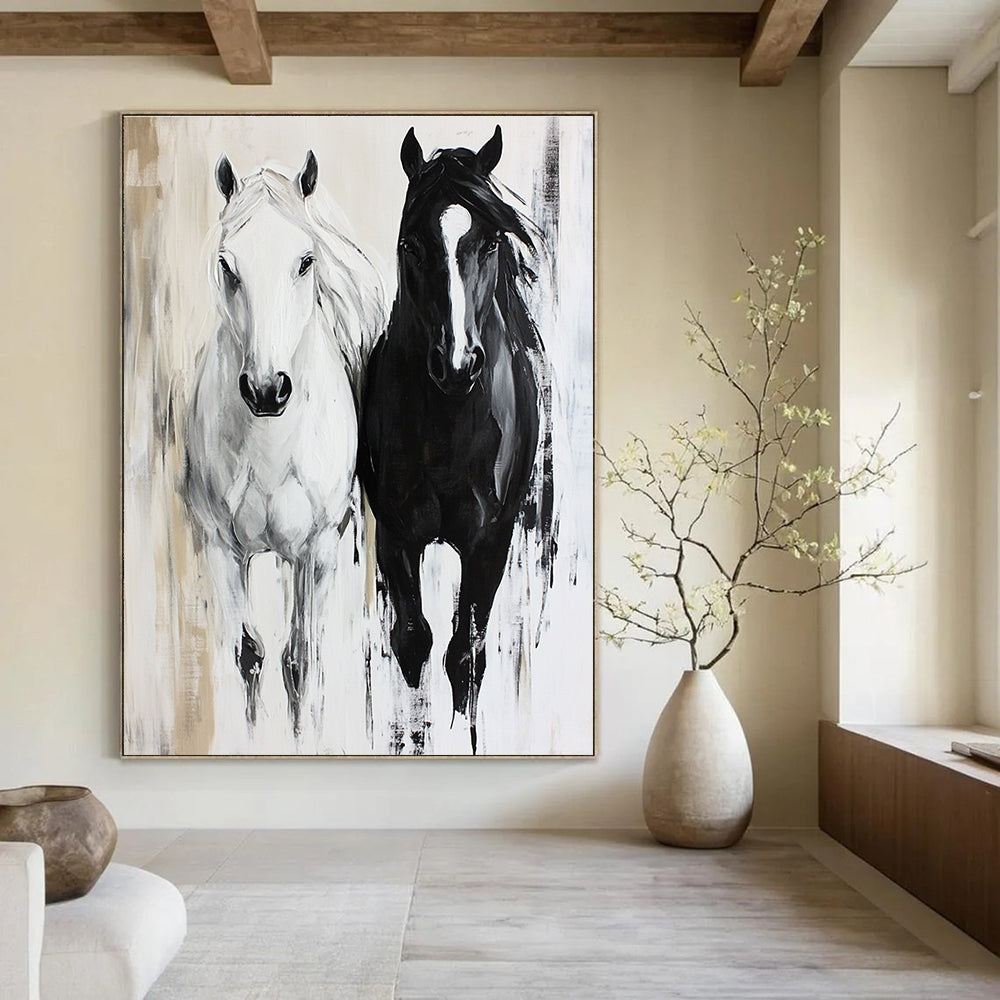 Inspired by the power and beauty of horses, the artist used bold brushstrokes to depict these two horses in motion. The contrast of black and white adds a dramatic and timeless quality. In an equestrian club lounge, it resonates with members' passion for horses, creating an energetic and engaging atmosphere. In a modern home hallway, it serves as a striking focal point, adding a touch of sophistication and strength to the entrance.Handmade Acrylic/oil painting on canvas, Unframed/Not stretched. Packing: Rolled and shipped in a solid tube. The painting come with EXTRA 2-3 inch white border around for stretching or framing. Delivery time: You will receive the painting around 7-12 days( 3-5 days to finish the painting, 5-7 days to your home.by Fedex And Dhl)
