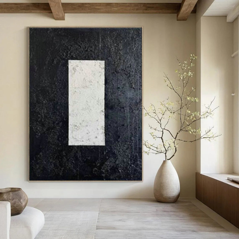 This black and white rectangular abstract art makes a bold statement. In a modern office reception, it welcomes visitors with a sense of sophistication and modernity. The contrast between the dark, textured background and the light rectangle creates a focal point that exudes professionalism, complementing sleek furniture and contemporary decor. In a minimalist living room, it adds an element of artistic intrigue. The simple yet striking design fits seamlessly with neutral tones and clean lines, enhancing the room's minimalist aesthetic while sparking conversations about abstract art. Whether in a corporate setting to impress clients or in a home to elevate the living space, this artwork brings a touch of modern elegance.Handmade Acrylic/oil painting on canvas, Unframed/Not stretched. Packing: Rolled and shipped in a solid tube. The painting come with EXTRA 2-3 inch white border around for stretching or framing. Delivery time: You will receive the painting around 7-12 days( 3-5 days to finish the painting, 5-7 days to your home.by Fedex And Dhl)