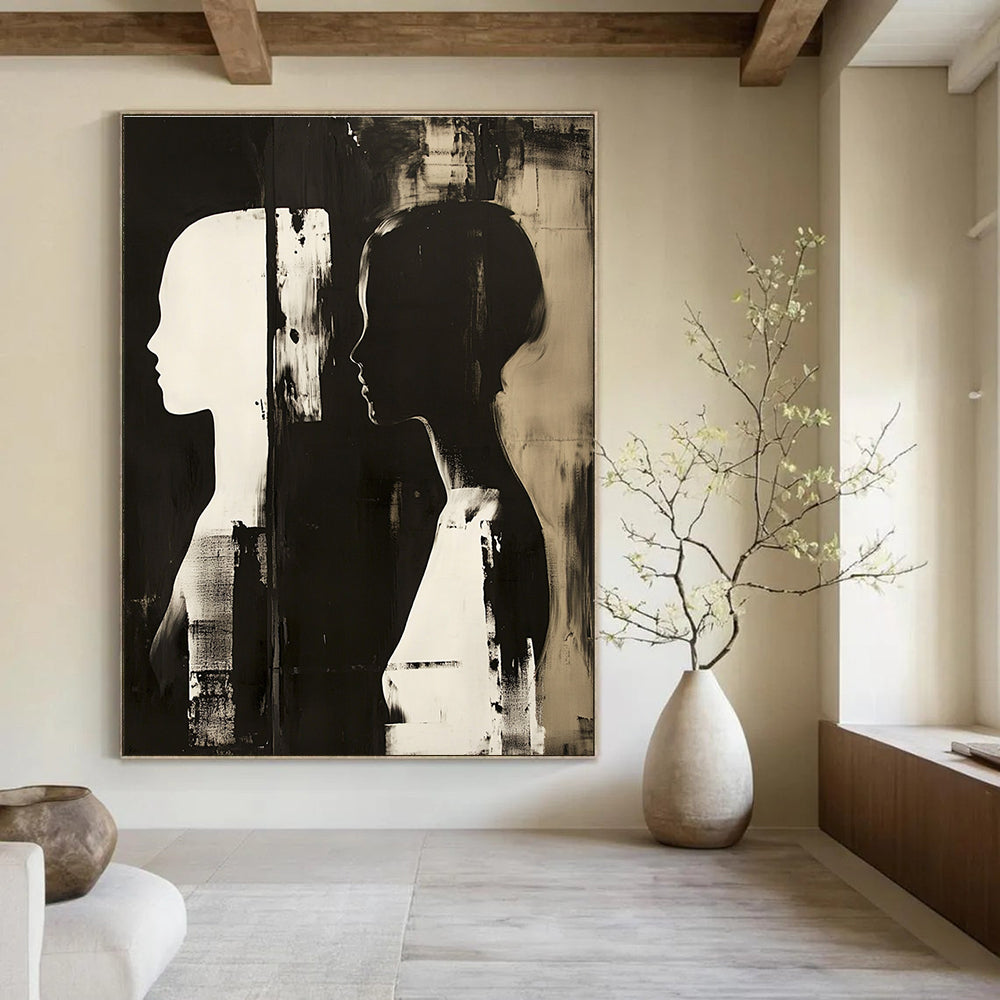 Motivated by the simplicity of black and white and the depth of human form, the artist created these contrasting silhouettes. The brushstrokes and negative spaces add a sense of movement and mystery. In a monochrome gallery, it fits the minimalist aesthetic, standing out with its bold shapes. In a serene home meditation room, it creates a calm and contemplative atmosphere, ideal for self - reflection and mindfulness.Handmade Acrylic/oil painting on canvas, Unframed/Not stretched. Packing: Rolled and shipped in a solid tube. The painting come with EXTRA 2-3 inch white border around for stretching or framing. Delivery time: You will receive the painting around 7-12 days( 3-5 days to finish the painting, 5-7 days to your home.by Fedex And Dhl)