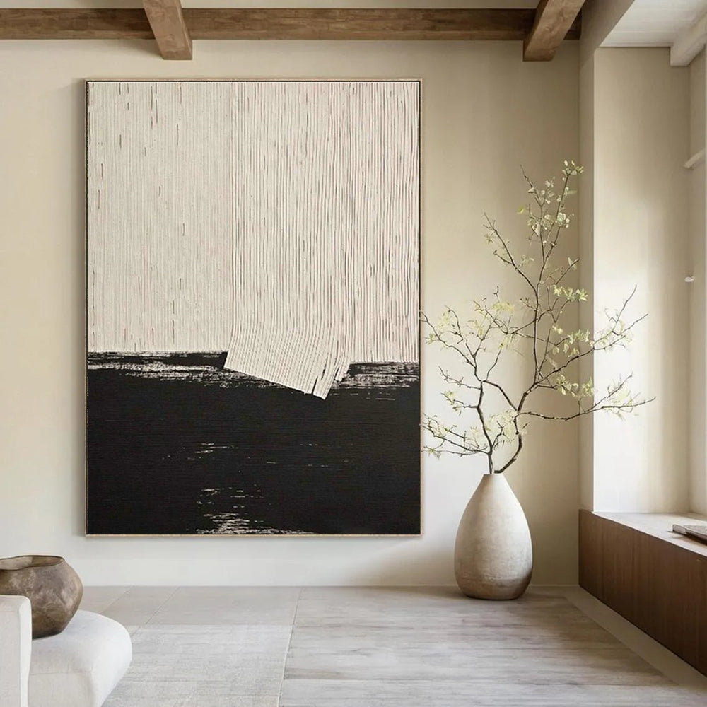 Aiming for simplicity and visual impact, the artist used vertical stripes in black and white. The texture of the stripes adds depth, making it suitable for a minimalist office to maintain a focused atmosphere or a monochrome bedroom to add a subtle yet stylish element.Handmade Acrylic/oil painting on canvas, Unframed/Not stretched. Packing: Rolled and shipped in a solid tube. The painting come with EXTRA 2-3 inch white border around for stretching or framing. Delivery time: You will receive the painting around 7-12 days( 3-5 days to finish the painting, 5-7 days to your home.by Fedex And Dhl)