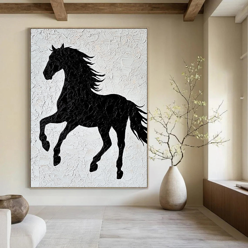 Inspired by the elegance of a horse’s form, the artist used a stark black silhouette against a textured background. The simplicity of the design makes a strong visual impact. Perfect for a modern minimalist home to add a touch of sophistication or an equestrian - themed art gallery to celebrate horse art.Handmade Acrylic/oil painting on canvas, Unframed/Not stretched. Packing: Rolled and shipped in a solid tube. The painting come with EXTRA 2-3 inch white border around for stretching or framing. Delivery time: You will receive the painting around 7-12 days( 3-5 days to finish the painting, 5-7 days to your home.by Fedex And Dhl)