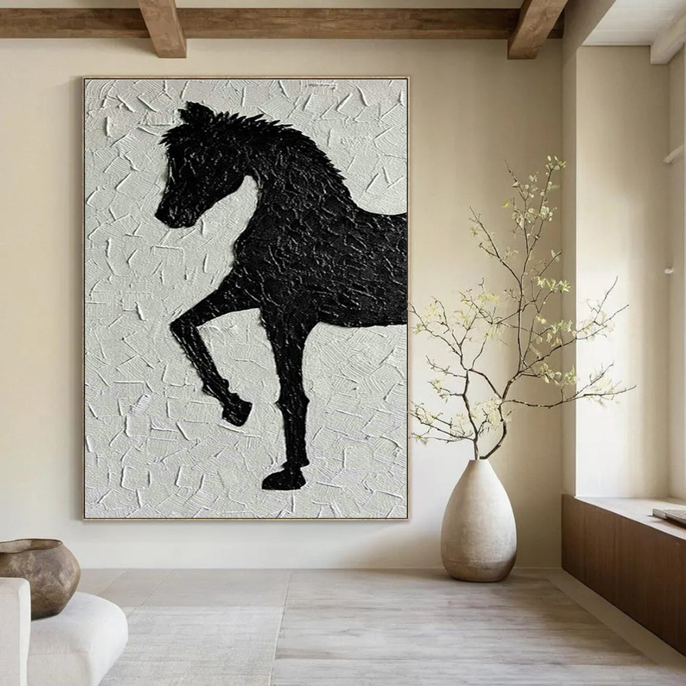 The black horse silhouette textured art captures the grace and power of a horse. In an equestrian center, it resonates deeply with horse enthusiasts. Hung in a lounge or common area, it celebrates the equestrian lifestyle, with the textured surface adding a tactile dimension that complements the center's rustic and natural ambiance. The silhouette's bold form stands out against the cracked, light background, making it a visually appealing piece. In a rustic home office, it brings a touch of the outdoors inside. The artwork's earthy tones and equestrian theme inspire a sense of freedom and productivity, pairing well with wooden desks, leather chairs, and other rustic elements. Whether in a center for fellow horse lovers or in a home office for a dose of inspiration, this art adds a unique, rustic charm.Handmade Acrylic/oil painting on canvas, Unframed/Not stretched. Packing: Rolled and shipped in a solid tube. The painting come with EXTRA 2-3 inch white border around for stretching or framing. Delivery time: You will receive the painting around 7-12 days( 3-5 days to finish the painting, 5-7 days to your home.by Fedex And Dhl)