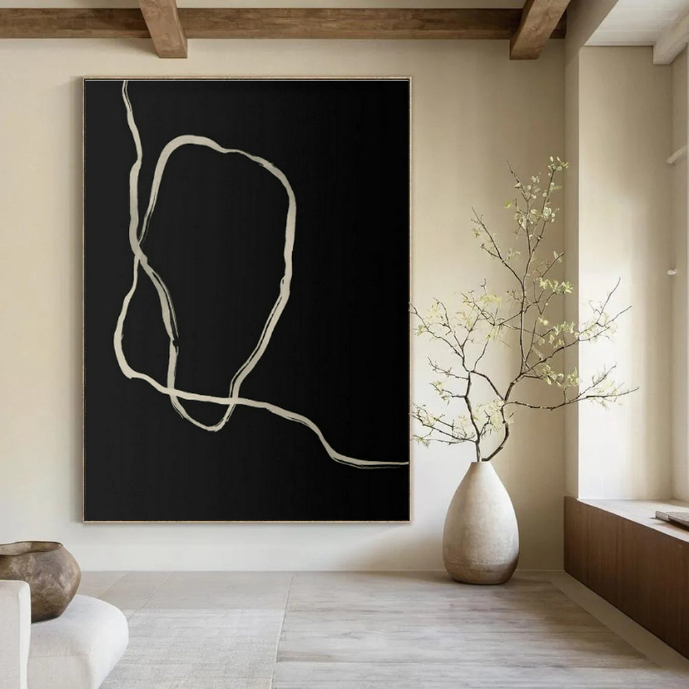 The black - line abstract art on a black background is a bold and mysterious piece. In the living room, hang it to create a dramatic and modern focal point. The white, flowing lines can add a sense of movement and intrigue to a dark - themed living space. It pairs well with black or dark - colored furniture, creating a cohesive and stylish look. In the bedroom, place it in a corner to add a touch of artistic mystery. The abstract lines can spark the imagination, making your bedroom a more personal and thought - provoking space for relaxation and reflection.Handmade Acrylic/oil painting on canvas, Unframed/Not stretched. Packing: Rolled and shipped in a solid tube. The painting come with EXTRA 2-3 inch white border around for stretching or framing. Delivery time: You will receive the painting around 7-12 days( 3-5 days to finish the painting, 5-7 days to your home.by Fedex And Dhl)