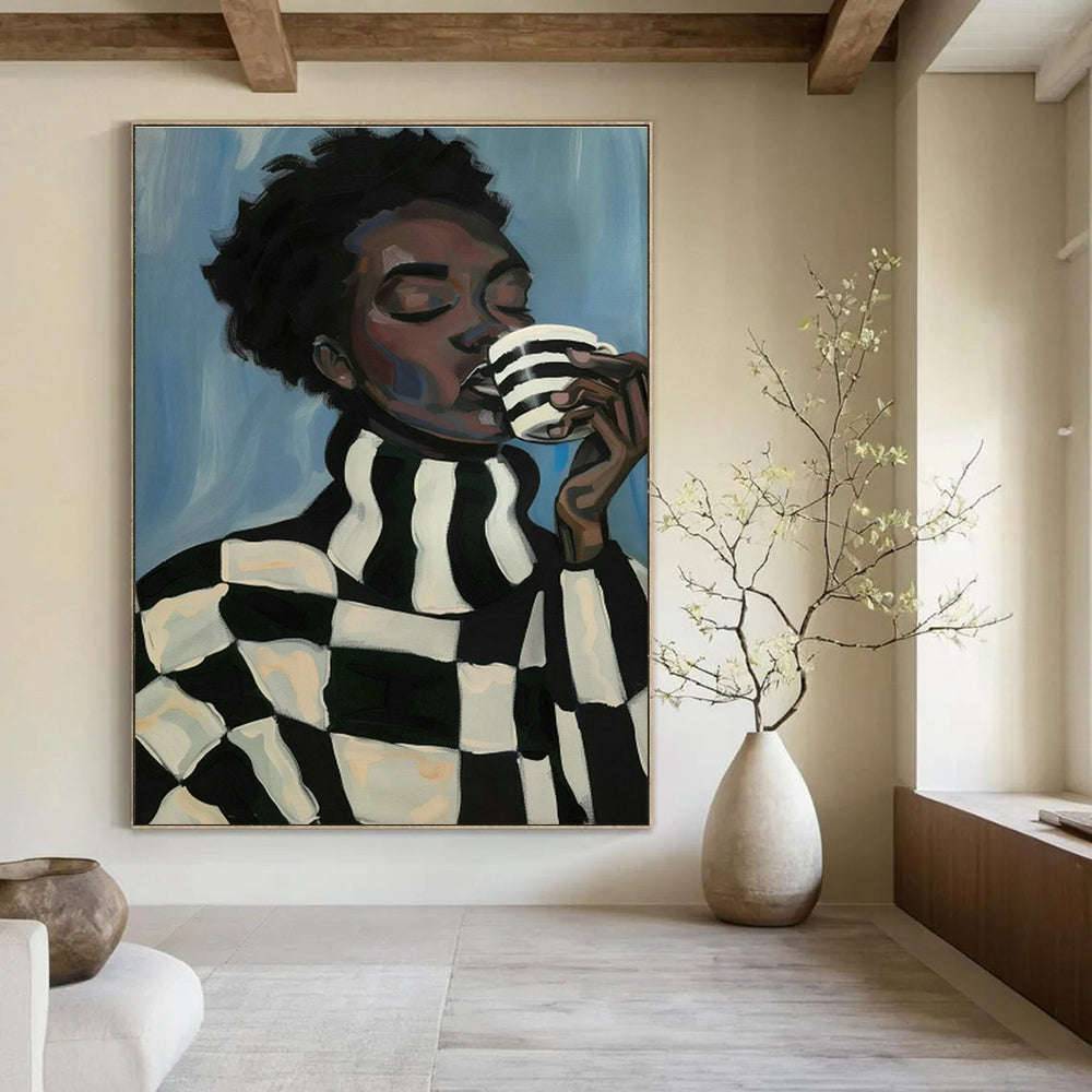 A figure in a checkered top sips from a striped cup, blending style and comfort. In a café corner, it creates a relatable, cozy atmosphere for coffee breaks, the familiar scene of enjoying a drink making customers feel at home. In a modern kitchen, hang it above the dining nook – it brings a touch of artistic charm to meal times, making everyday dinners feel like a stylish culinary experience.Handmade Acrylic/oil painting on canvas, Unframed/Not stretched. Packing: Rolled and shipped in a solid tube. The painting come with EXTRA 2-3 inch white border around for stretching or framing. Delivery time: You will receive the painting around 7-12 days( 3-5 days to finish the painting, 5-7 days to your home.by Fedex And Dhl)