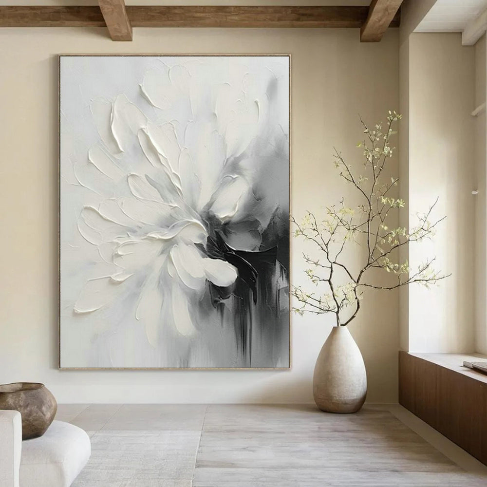 The simple black - white color scheme, with thick paint stacking to create the three - dimensional sense of flowers, is simple yet full of artistic tension. In a minimalist home, paired with plain - colored sofas and wooden furniture, the painting becomes the artistic highlight of the space, perfectly embodying the aesthetic of “less is more”, making every corner of the home exude a simple and advanced temperament. Placed in a monochrome - themed café, blending with the black - white - gray space environment, when customers drink coffee and think here, the flowers in the painting are like silent artistic messengers, accompanying people through quiet times, turning the café into a spiritual haven in the city.Handmade Acrylic/oil painting on canvas, Unframed/Not stretched. Packing: Rolled and shipped in a solid tube. The painting come with EXTRA 2-3 inch white border around for stretching or framing. Delivery time: You will receive the painting around 7-12 days( 3-5 days to finish the painting, 5-7 days to your home.by Fedex And Dhl)