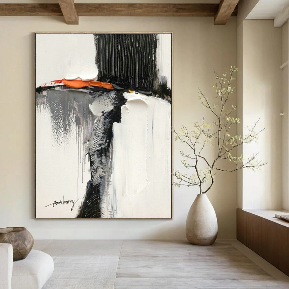 This artwork combines classic black and white with a bold pop of orange, making a strong visual statement. In an art gallery pop - up, it stands out among other exhibits, drawing visitors in with its striking contrast. The abstract nature invites interpretation, encouraging discussions and engagement with the art. In a trendy restaurant dining area, it adds a touch of modern sophistication to the space. The orange accents can stimulate the appetite, and the overall aesthetic enhances the dining experience, making meals feel like a more artistic and memorable occasion.Handmade Acrylic/oil painting on canvas, Unframed/Not stretched. Packing: Rolled and shipped in a solid tube. The painting come with EXTRA 2-3 inch white border around for stretching or framing. Delivery time: You will receive the painting around 7-12 days( 3-5 days to finish the painting, 5-7 days to your home.by Fedex And Dhl)