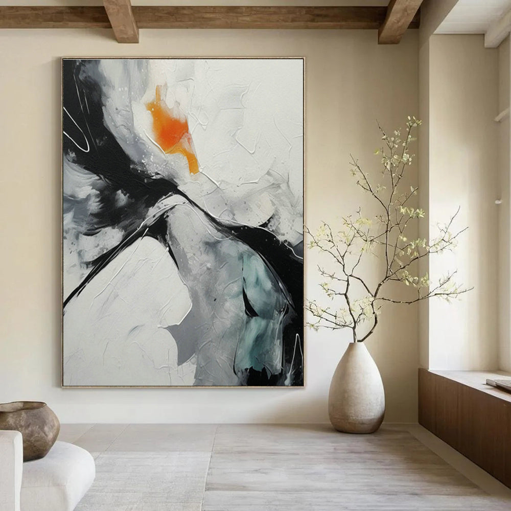Contrasting black, white, and a pop of orange form a bold, dynamic composition. In an urban loft apartment, with exposed ducts and industrial furniture, it matches the edgy, modern decor. The orange adds a splash of color to the neutral space, reflecting the resident’s bold style. In a modern art bar, where art and mixology meet, it becomes a conversation piece. Patrons sipping creative cocktails can discuss the painting’s abstract forms, and the vibrant orange mirrors the energy of the bar’s innovative drink menu.Handmade Acrylic/oil painting on canvas, Unframed/Not stretched. Packing: Rolled and shipped in a solid tube. The painting come with EXTRA 2-3 inch white border around for stretching or framing. Delivery time: You will receive the painting around 7-12 days( 3-5 days to finish the painting, 5-7 days to your home.by Fedex And Dhl)
