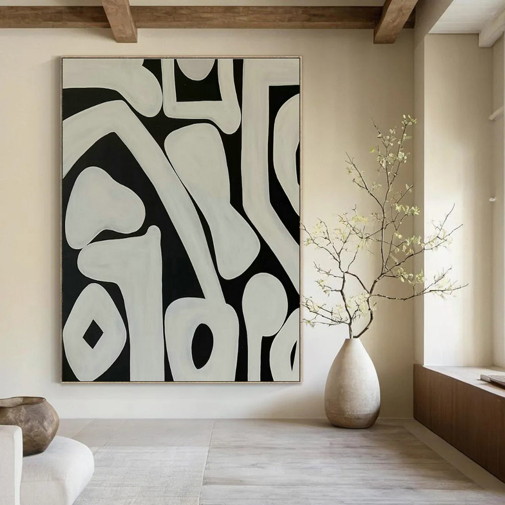 This black - white patterned abstract art is a nod to retro - modern style. In an urban art café with a mix of vintage and contemporary decor, it adds a graphic punch. The intricate patterns and bold contrast make it a visual delight for patrons enjoying their lattes. In a mid - century modern home characterized by clean lines and organic shapes, it complements the aesthetic seamlessly. The art’s geometric patterns and monochromatic palette enhance the home’s stylish, nostalgic vibe. Whether in a café for urban art appreciation or a home for mid - century modern living, this piece brings a retro - cool edge.Handmade Acrylic/oil painting on canvas, Unframed/Not stretched. Packing: Rolled and shipped in a solid tube. The painting come with EXTRA 2-3 inch white border around for stretching or framing. Delivery time: You will receive the painting around 7-12 days( 3-5 days to finish the painting, 5-7 days to your home.by Fedex And Dhl)