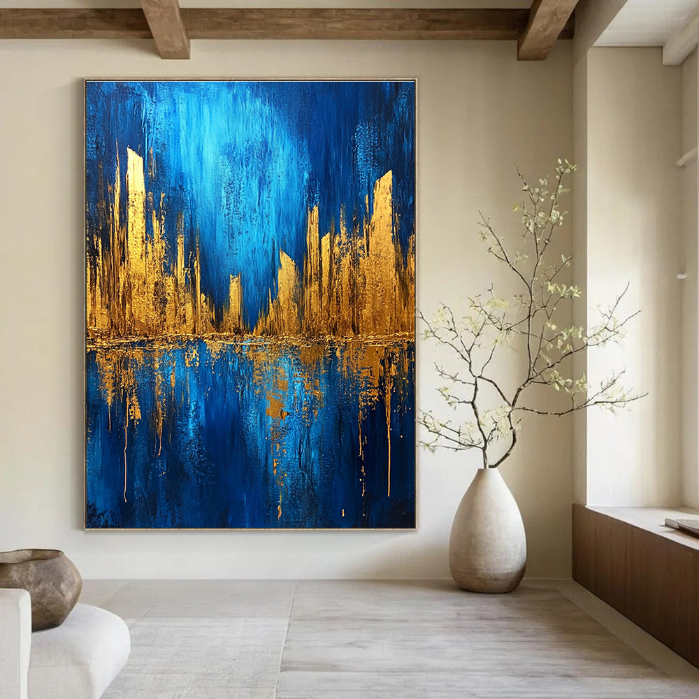 Enchanted by the beauty of urban skylines and the allure of gold, the artist painted a cityscape that shimmers with metallic accents. The reflection in the water adds depth and a sense of tranquility. It’s ideal for a modern living room, adding a touch of sophistication and a view - like quality, or a travel - lover’s lounge, evoking the excitement of visiting beautiful cities around the world.Handmade Acrylic/oil painting on canvas, Unframed/Not stretched. Packing: Rolled and shipped in a solid tube. The painting come with EXTRA 2-3 inch white border around for stretching or framing. Delivery time: You will receive the painting around 7-12 days( 3-5 days to finish the painting, 5-7 days to your home.by Fedex And Dhl)