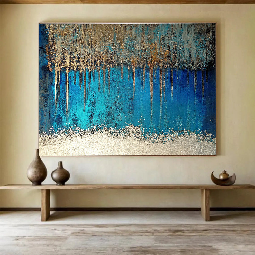 Fascinated by the beauty of dripping paint, the artist used rich blues and golds to create a luxurious, textured piece. The drips and the sparkling elements add a touch of opulence. This artwork is perfect for a luxury bathroom to create a spa - like feel or an upscale hotel lobby to make a grand impression.Handmade Acrylic/oil painting on canvas, Unframed/Not stretched. Packing: Rolled and shipped in a solid tube. The painting come with EXTRA 2-3 inch white border around for stretching or framing. Delivery time: You will receive the painting around 7-12 days( 3-5 days to finish the painting, 5-7 days to your home.by Fedex And Dhl)