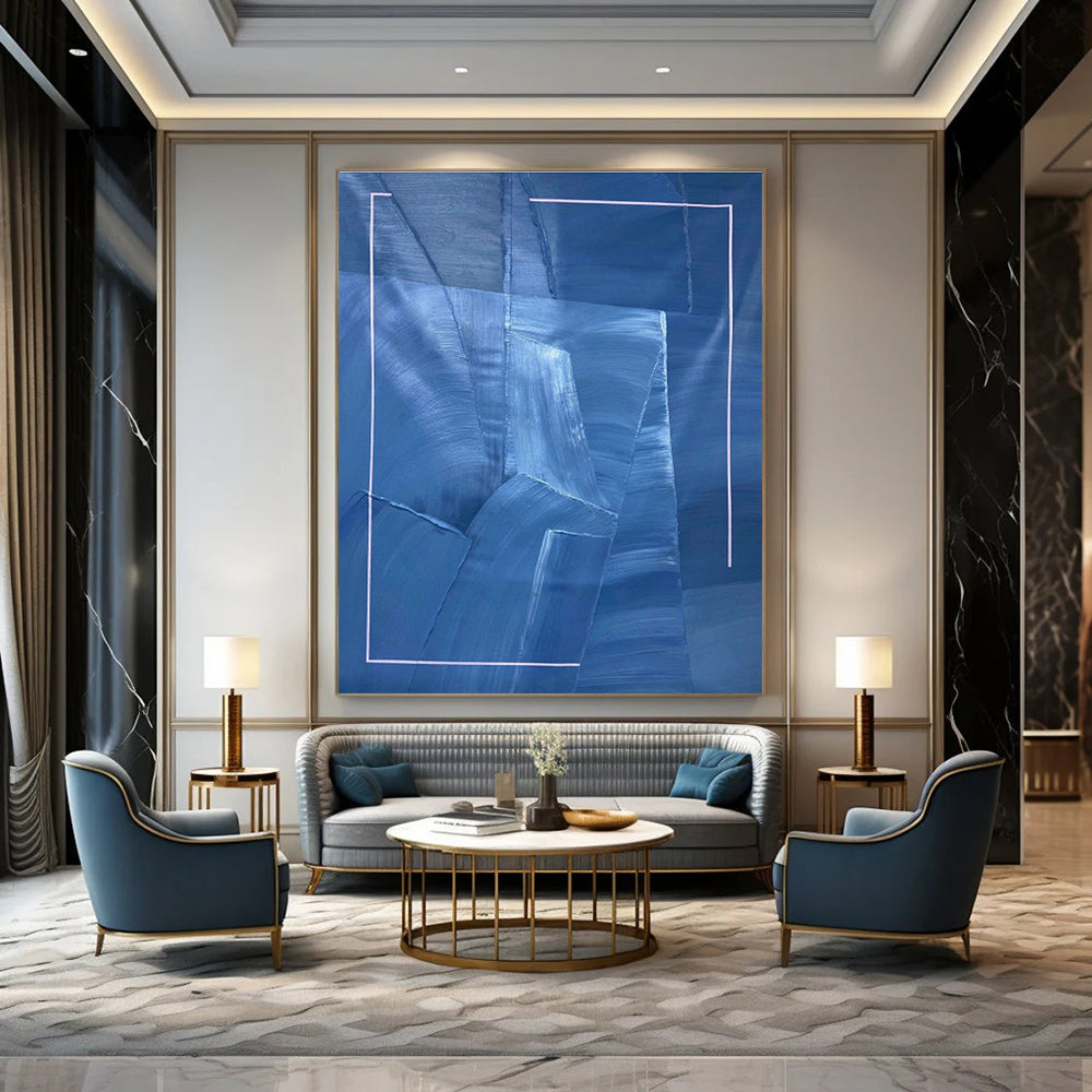 Cool blue and white geometric shapes evoke a calm, modern - coastal feel. In a coastal - inspired office, it brings the serenity of the sea to workdays. Hang it in the meeting room – the soothing colors help focus minds during brainstorming, as if the ocean’s rhythm is guiding ideas. In a Scandinavian - style home, it aligns with the minimalist, light - filled aesthetic. Position it in the living room – the clean lines and soft hues complement neutral tones, making the space feel like a peaceful, stylish retreat.Handmade Acrylic/oil painting on canvas, Unframed/Not stretched. Packing: Rolled and shipped in a solid tube. The painting come with EXTRA 2-3 inch white border around for stretching or framing. Delivery time: You will receive the painting around 7-12 days( 3-5 days to finish the painting, 5-7 days to your home.by Fedex And Dhl)