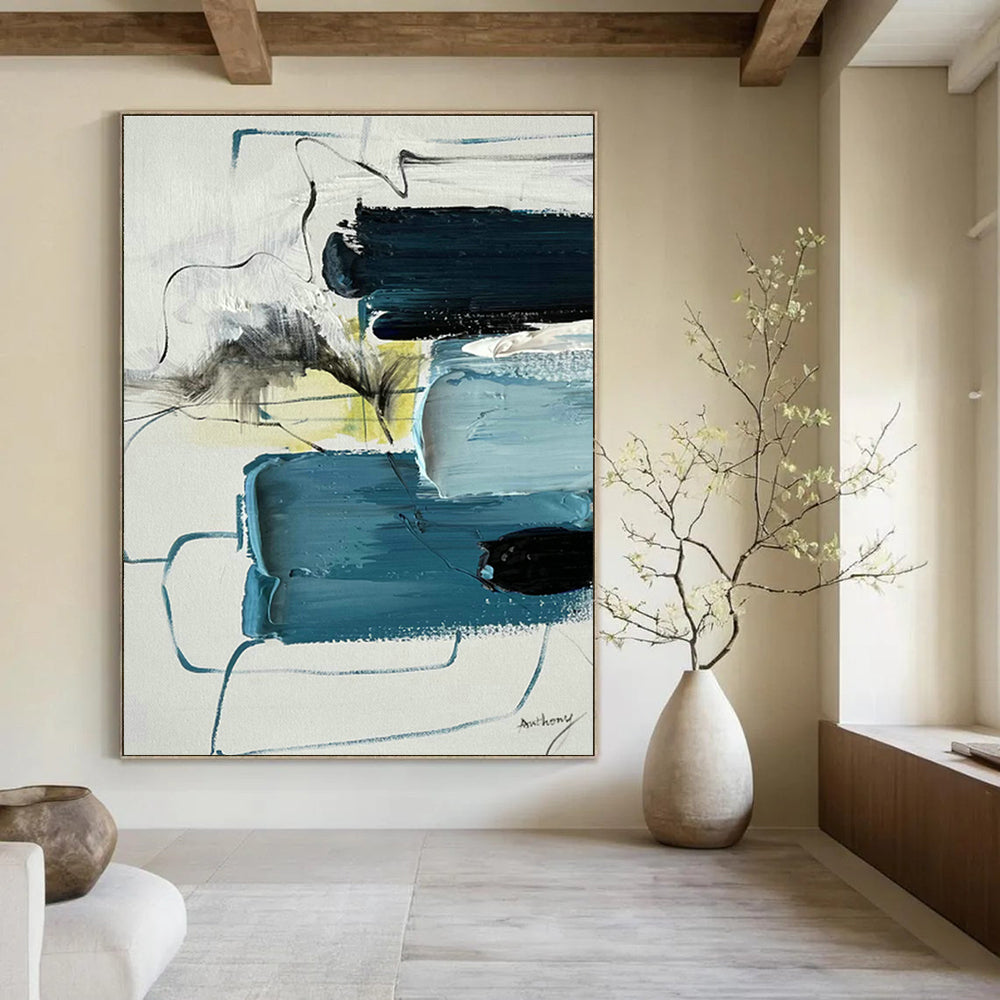 Blue - gray lines, simple yet with an urban artistic feel. In an urban - style library, hung in the reading area, the line art adds a cultural and artistic atmosphere to the quiet reading environment. When readers take a break, they can appreciate the art and relax. In a modern apartment living room, hung next to the TV background, paired with simple furniture, it enhances the living room’s artistic taste. When the family relaxes, it becomes an artistic embellishment in the warm atmosphere, making home time more aesthetically enjoyable.Handmade Acrylic/oil painting on canvas, Unframed/Not stretched. Packing: Rolled and shipped in a solid tube. The painting come with EXTRA 2-3 inch white border around for stretching or framing. Delivery time: You will receive the painting around 7-12 days( 3-5 days to finish the painting, 5-7 days to your home.by Fedex And Dhl)