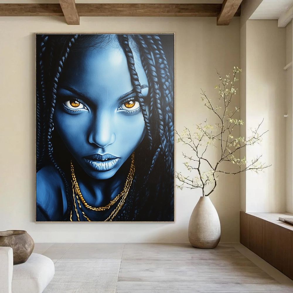 Motivated by cultural beauty, the artist used a monochromatic blue palette and detailed braids. It honors diversity and individuality. In a cultural art space, it sparks discussions about identity and art. In an ethnic - inspired boutique, it adds a unique, artistic touch, attracting customers interested in cultural art and fashion.Handmade Acrylic/oil painting on canvas, Unframed/Not stretched. Packing: Rolled and shipped in a solid tube. The painting come with EXTRA 2-3 inch white border around for stretching or framing. Delivery time: You will receive the painting around 7-12 days( 3-5 days to finish the painting, 5-7 days to your home.by Fedex And Dhl)