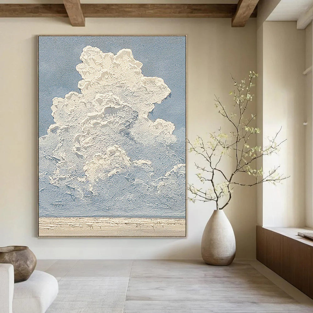 Textured white clouds against a blue sky meet a sandy sea, capturing the tranquility of nature. In a coastal home, it brings the beauty of the ocean indoors, complementing beach - themed decor, from seashell collections to driftwood accents. The textured surface and serene colors create a calming atmosphere, perfect for relaxation. In a wellness center, it enhances the peaceful, nature - focused ambiance, ideal for meditation and stress relief. Paired with soft lighting and calming music, it turns the wellness center into a coastal - inspired retreat. Whether in a seaside home or a wellness center, this art transports you to a peaceful coastal landscape, turning spaces into havens of relaxation and natural beauty.Handmade Acrylic/oil painting on canvas, Unframed/Not stretched. Packing: Rolled and shipped in a solid tube. The painting come with EXTRA 2-3 inch white border around for stretching or framing. Delivery time: You will receive the painting around 7-12 days( 3-5 days to finish the painting, 5-7 days to your home.by Fedex And Dhl)