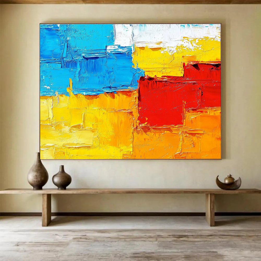 Driven by the energy of color, the artist uses thick, textured blocks of blue, yellow, and red. It's a celebration of bold hues and abstract forms, ideal for a contemporary art gallery to showcase artistic innovation or a vibrant café to create a lively, inviting atmosphere.Handmade Acrylic/oil painting on canvas, Unframed/Not stretched. Packing: Rolled and shipped in a solid tube. The painting come with EXTRA 2-3 inch white border around for stretching or framing. Delivery time: You will receive the painting around 7-12 days( 3-5 days to finish the painting, 5-7 days to your home.by Fedex And Dhl)