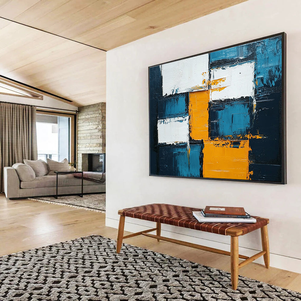 The artist plays with geometric shapes and contrasting colors (blue, orange, white). By stacking blocks, they explore balance and visual interest. Great for a creative studio to inspire ideas or a contemporary gallery to display modern art.Handmade Acrylic/oil painting on canvas, Unframed/Not stretched. Packing: Rolled and shipped in a solid tube. The painting come with EXTRA 2-3 inch white border around for stretching or framing. Delivery time: You will receive the painting around 7-12 days( 3-5 days to finish the painting, 5-7 days to your home.by Fedex And Dhl)