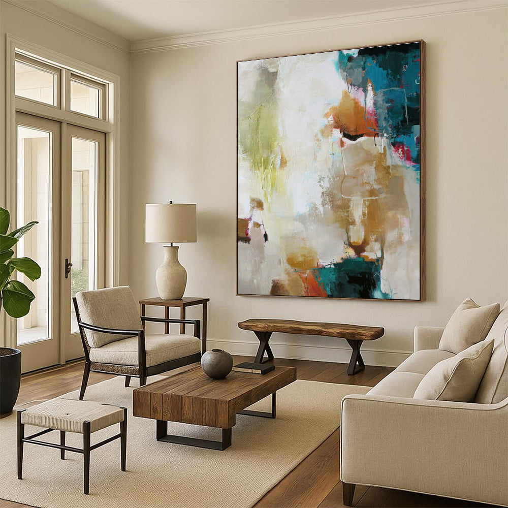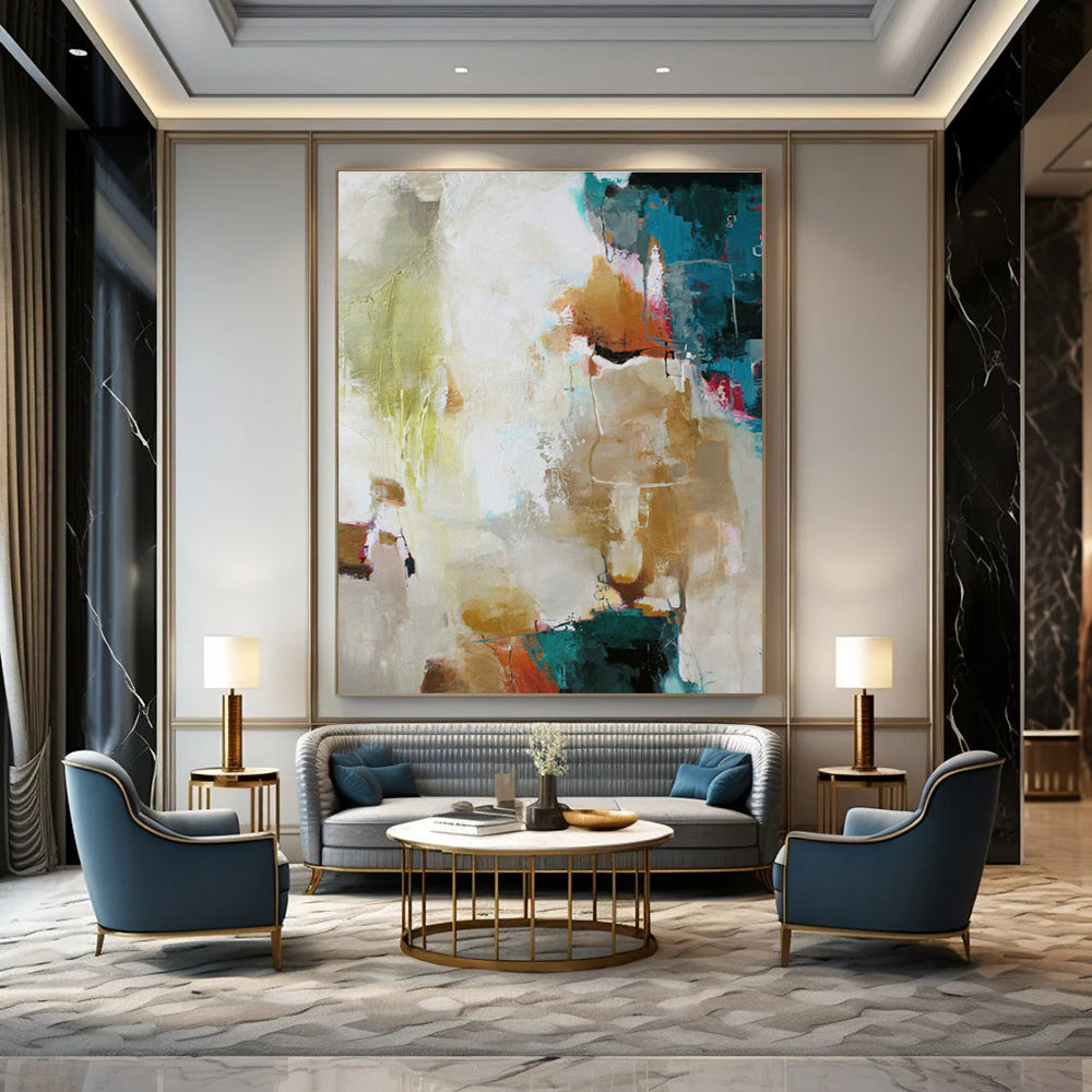Vivid greens, pinks, teals, and soft neutrals form a lively, eclectic piece. In a bohemian café, it matches the free - spirited vibe—bright colors and mixed shapes complement mismatched furniture and indie coffee culture, sparking conversations over lattes. In a creative studio, it fuels inspiration—its playful palette and abstract forms break creative blocks, perfect for artists and designers. A must - have for spaces that celebrate individuality, turning casual hangs or work sessions into colorful, artistic adventures.Handmade Acrylic/oil painting on canvas, Unframed/Not stretched. Packing: Rolled and shipped in a solid tube. The painting come with EXTRA 2-3 inch white border around for stretching or framing. Delivery time: You will receive the painting around 7-12 days( 3-5 days to finish the painting, 5-7 days to your home.by Fedex And Dhl)