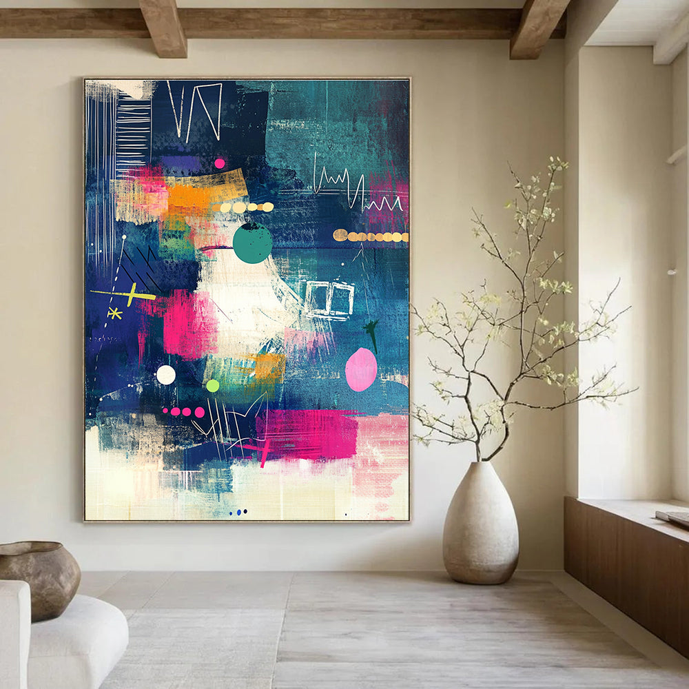 Driven by the joy of color and the freedom of abstraction, the artist mixed various shapes, colors, and lines to create this lively composition. Each element was a burst of creative energy. In a creative coworking space, it stimulates innovative thinking among workers, adding a vibrant, artistic atmosphere. In an art - loving café, it serves as a eye - catching centerpiece, enhancing the coffee - drinking experience with its bold, colorful design.Handmade Acrylic/oil painting on canvas, Unframed/Not stretched. Packing: Rolled and shipped in a solid tube. The painting come with EXTRA 2-3 inch white border around for stretching or framing. Delivery time: You will receive the painting around 7-12 days( 3-5 days to finish the painting, 5-7 days to your home.by Fedex And Dhl)