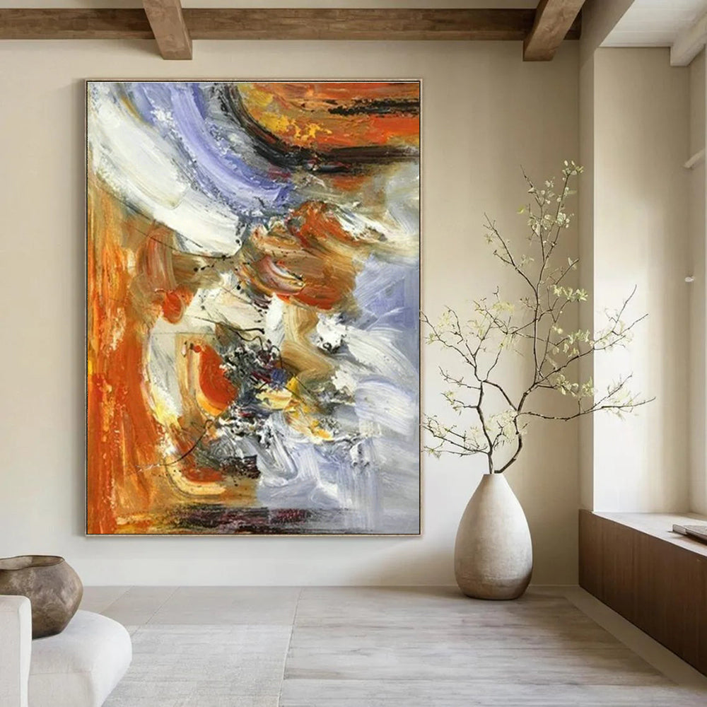 This vibrant abstract piece blends a wild mix of hues—orange, purple, white, and more—like a chaotic yet harmonious symphony of color. Hang it in a creative studio to ignite designers’ and artists’ imaginations, the bold strokes and clashing tones sparking fresh ideas during brainstorming. In a modern café, with sleek metal chairs and minimalist tables, it becomes a focal point. Patrons sipping coffee will be drawn to its dynamic energy, turning the café into an art - infused social spot where conversations flow as freely as the painting’s brushstrokes.Handmade Acrylic/oil painting on canvas, Unframed/Not stretched. Packing: Rolled and shipped in a solid tube. The painting come with EXTRA 2-3 inch white border around for stretching or framing. Delivery time: You will receive the painting around 7-12 days( 3-5 days to finish the painting, 5-7 days to your home.by Fedex And Dhl)
