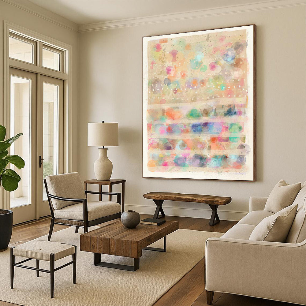 Bright, scattered dots and stripes. Sparks imagination in classroom spaces, perfect for young learners.Handmade Acrylic/oil painting on canvas, Unframed/Not stretched. Packing: Rolled and shipped in a solid tube. The painting come with EXTRA 2-3 inch white border around for stretching or framing. Delivery time: You will receive the painting around 7-12 days( 3-5 days to finish the painting, 5-7 days to your home.by Fedex And Dhl)