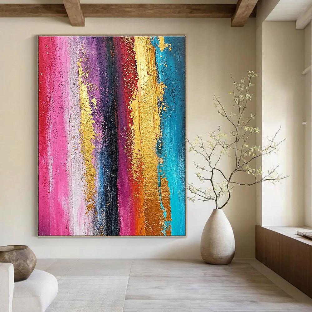 Bursting with vibrant colors and bold gold stripes, this painting is a celebration of creativity and energy. The artist layered different hues and added gold to create a sense of rhythm and visual excitement. It’s perfect for a boutique, where its lively aesthetic can attract customers, or a creative studio, inspiring innovative ideas with its bold use of color.Handmade Acrylic/oil painting on canvas, Unframed/Not stretched. Packing: Rolled and shipped in a solid tube. The painting come with EXTRA 2-3 inch white border around for stretching or framing. Delivery time: You will receive the painting around 7-12 days( 3-5 days to finish the painting, 5-7 days to your home.by Fedex And Dhl)