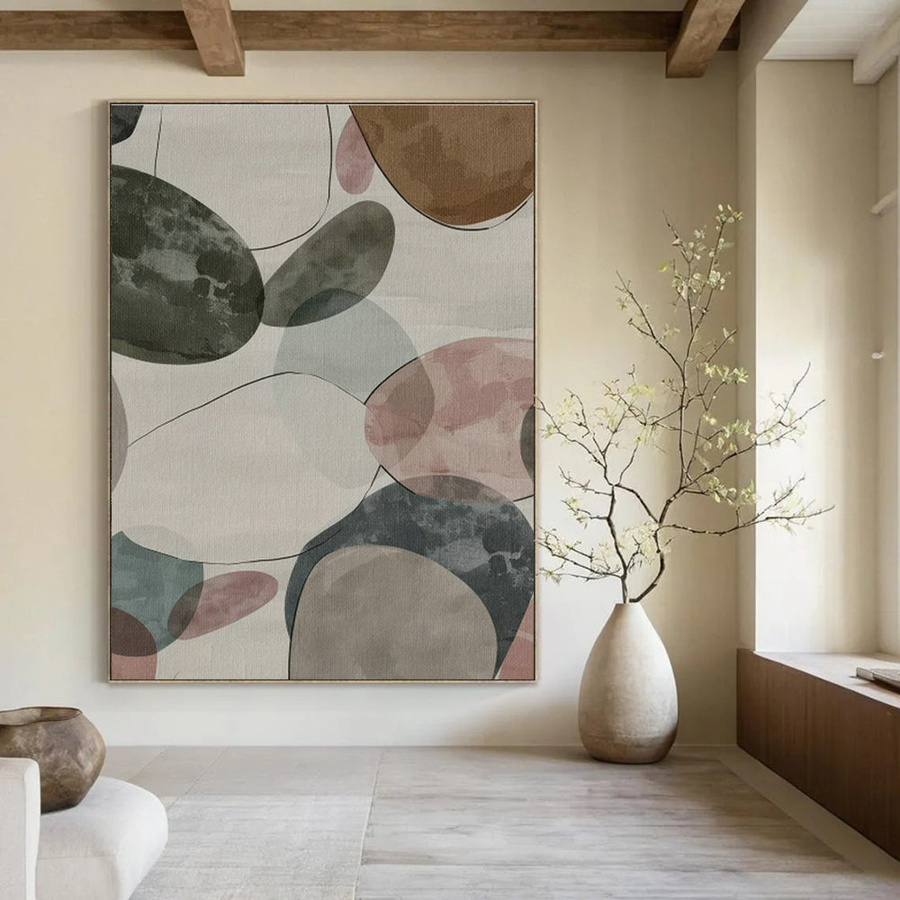 Softly colored, overlapping stone shapes create a whimsical, beachy vibe. In a coastal café, it complements seashell - themed decor and light, airy interiors, transporting customers to a seaside stroll. The pastel tones and playful pattern make it perfect for enjoying a morning coffee or an afternoon snack. In a home kitchen, it adds a cheerful, casual touch to the heart of the home. Hung above a breakfast nook or near open shelving, it pairs with ceramic dishes and fresh produce, turning meal prep and family meals into joyful experiences. This art brings a touch of coastal charm and everyday happiness to cafés and kitchens alike.Handmade Acrylic/oil painting on canvas, Unframed/Not stretched. Packing: Rolled and shipped in a solid tube. The painting come with EXTRA 2-3 inch white border around for stretching or framing. Delivery time: You will receive the painting around 7-12 days( 3-5 days to finish the painting, 5-7 days to your home.by Fedex And Dhl)