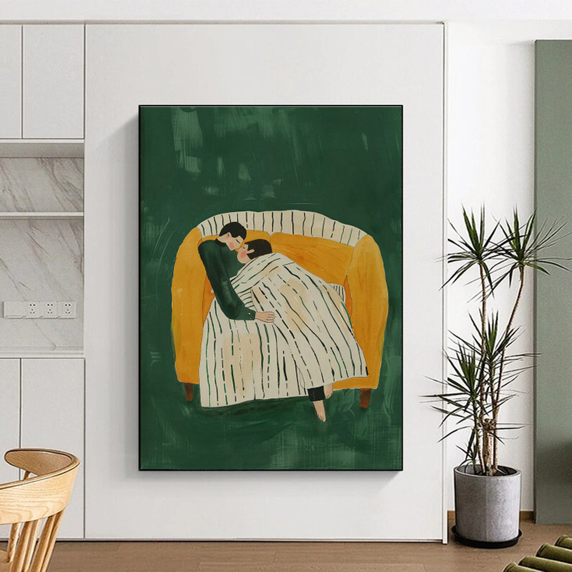 A couple cuddles on a sofa under a striped blanket, radiating love. In a romantic living room, it becomes a heartwarming centerpiece for date nights, the cozy scene mirroring shared moments of affection. As an anniversary gift space, it sets a loving mood, making the gift - giving experience feel extra special, as if the art is a symbol of enduring love.Handmade Acrylic/oil painting on canvas, Unframed/Not stretched. Packing: Rolled and shipped in a solid tube. The painting come with EXTRA 2-3 inch white border around for stretching or framing. Delivery time: You will receive the painting around 7-12 days( 3-5 days to finish the painting, 5-7 days to your home.by Fedex And Dhl)