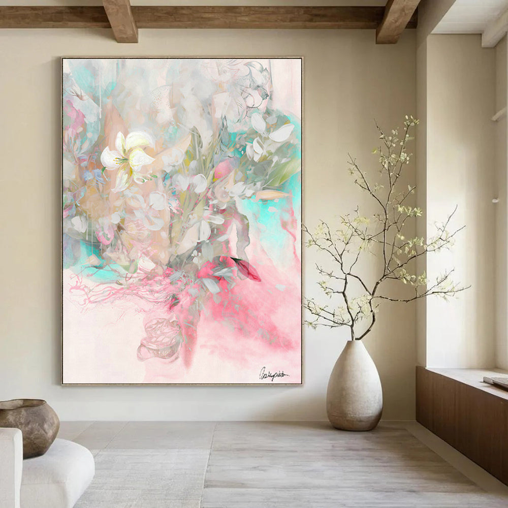 Soft, blended colors create a dreamy bouquet of flowers in this watercolor piece, with hints of pastel pinks, greens, and whites. In a wedding venue, it can adorn the walls of the ceremony or reception area, adding a romantic and ethereal touch to the celebration. The gentle hues and flowing lines complement the joyous atmosphere, making it a beautiful backdrop for exchanging vows or toasting to new beginnings. In a home bedroom, it brings a sense of tranquility and romance. Hung above the bed, the dreamy floral design and soft colors create a peaceful, inviting ambiance, perfect for winding down at the end of the day. Ideal for spaces that celebrate love and intimacy, turning wedding moments or bedroom retreats into enchanted, aesthetically pleasing experiences.Handmade Acrylic/oil painting on canvas, Unframed/Not stretched. Packing: Rolled and shipped in a solid tube. The painting come with EXTRA 2-3 inch white border around for stretching or framing. Delivery time: You will receive the painting around 7-12 days( 3-5 days to finish the painting, 5-7 days to your home.by Fedex And Dhl)