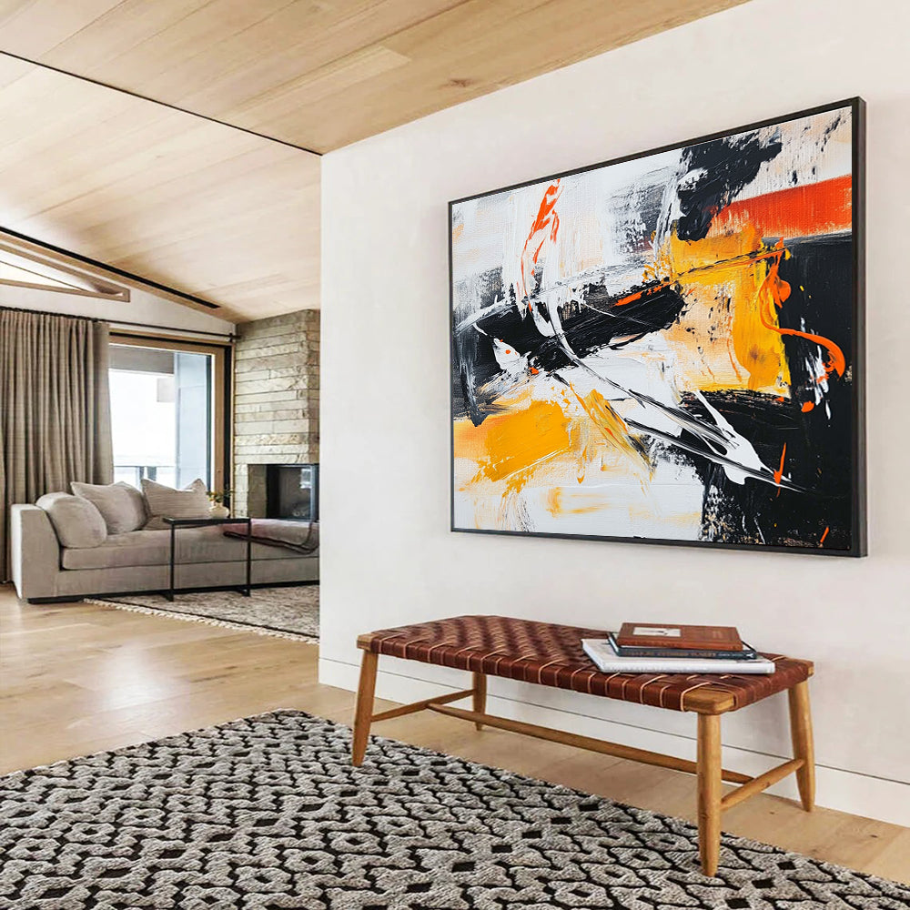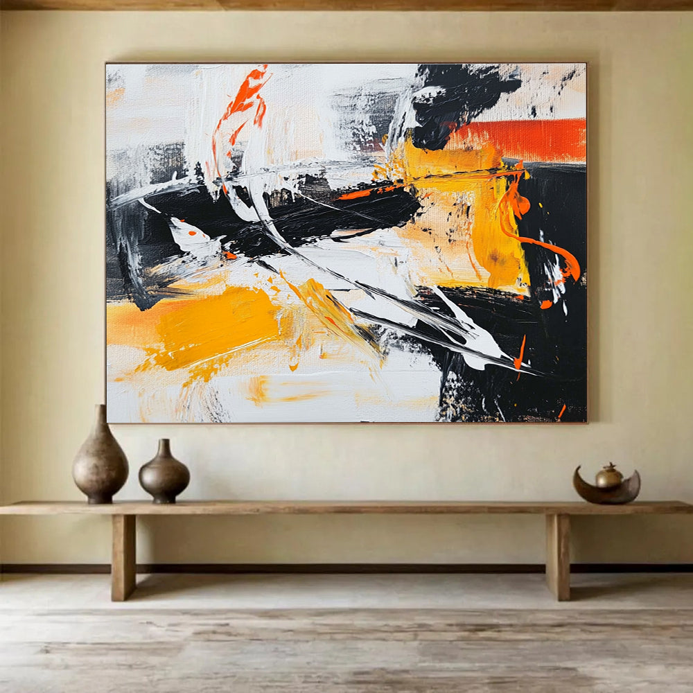 Captivated by energy, the artist mixed black, white, orange, and yellow in bold strokes. It aims to inspire creativity. Great for a creative studio to spark ideas or a trendy café to create a lively atmosphere.Handmade Acrylic/oil painting on canvas, Unframed/Not stretched. Packing: Rolled and shipped in a solid tube. The painting come with EXTRA 2-3 inch white border around for stretching or framing. Delivery time: You will receive the painting around 7-12 days( 3-5 days to finish the painting, 5-7 days to your home.by Fedex And Dhl)