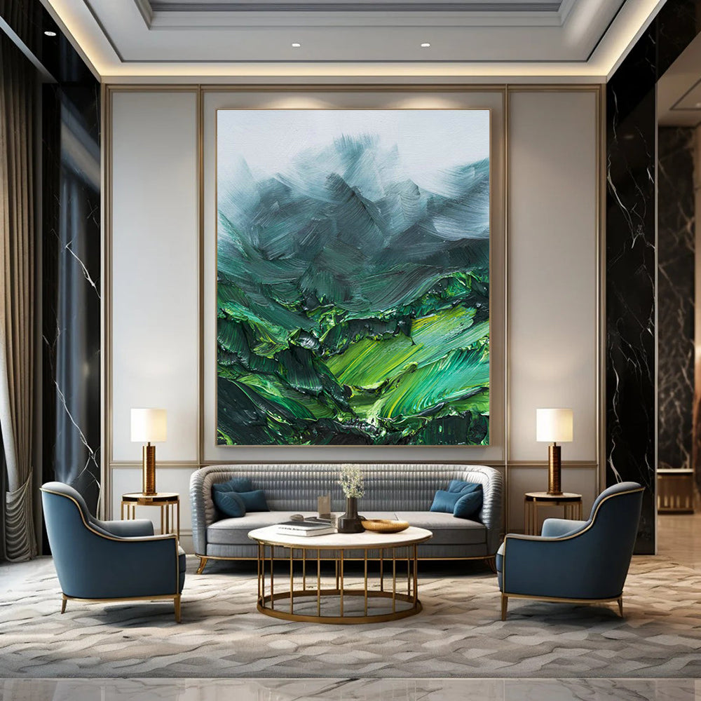 Textured greens sculpt a lush, vibrant mountain view. In a rustic log cabin dining area, with wooden beams and antler chandeliers, it brings the forest’s energy indoors—perfect for family meals with a wild, natural backdrop. At an eco - friendly retreat with recycled wood decor and nature - focused workshops, it fits the sustainable, earth - loving vibe. The bold brushstrokes and rich greens make every moment feel like a hike through a thriving mountain forest, ideal for spaces that celebrate nature’s raw beauty.Handmade Acrylic/oil painting on canvas, Unframed/Not stretched. Packing: Rolled and shipped in a solid tube. The painting come with EXTRA 2-3 inch white border around for stretching or framing. Delivery time: You will receive the painting around 7-12 days( 3-5 days to finish the painting, 5-7 days to your home.by Fedex And Dhl)