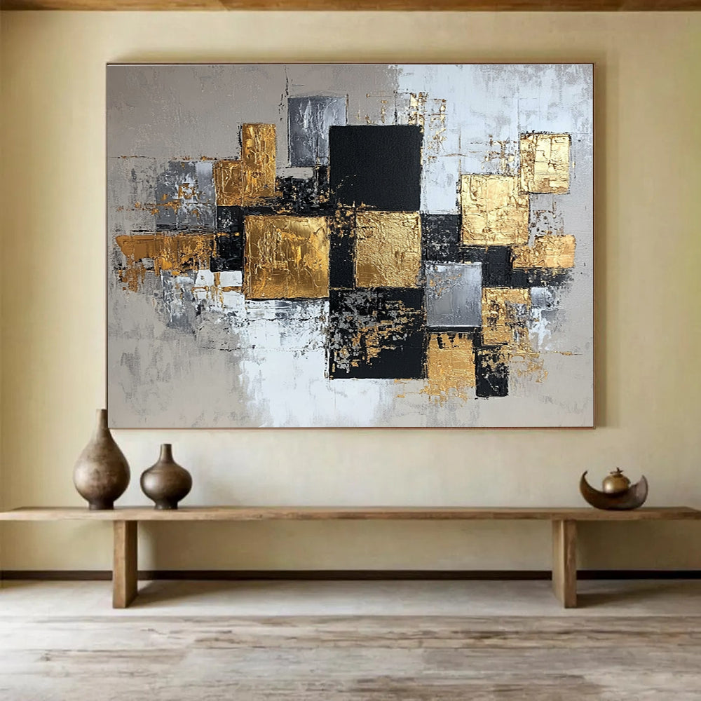 Inspired by luxury and structure, the artist combines gold, silver and black in a geometric abstract pattern. Suits a luxury hotel suite to enhance opulence or an upscale office to give a refined, professional look.Handmade Acrylic/oil painting on canvas, Unframed/Not stretched. Packing: Rolled and shipped in a solid tube. The painting come with EXTRA 2-3 inch white border around for stretching or framing. Delivery time: You will receive the painting around 7-12 days( 3-5 days to finish the painting, 5-7 days to your home.by Fedex And Dhl)