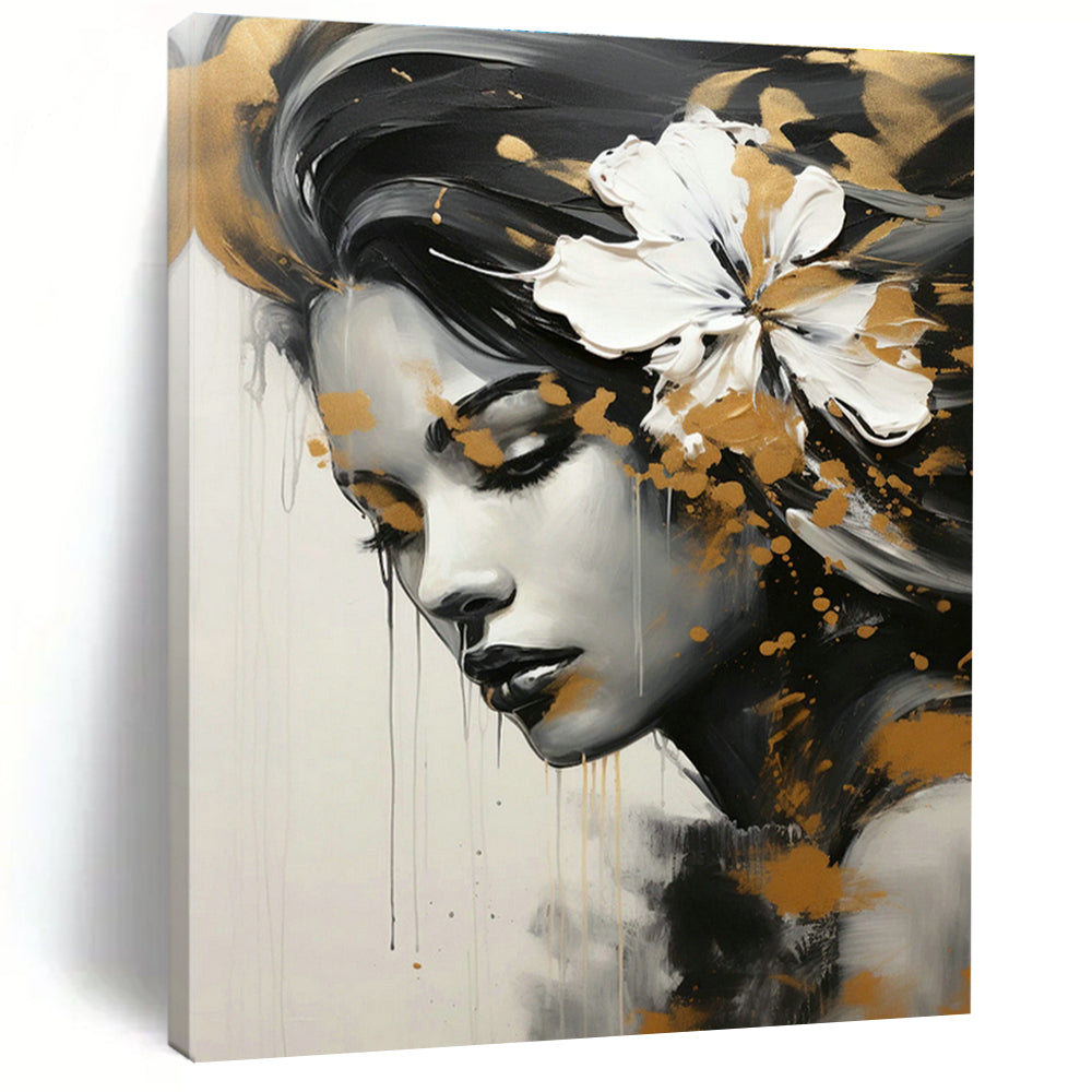 This gold - white flower female portrait exudes elegance and sophistication. In a luxury beauty salon, it creates a glamorous and relaxing atmosphere. The portrait’s beauty and the golden accents reflect the salon’s focus on enhancing beauty, making clients feel pampered and inspired. It can be displayed in the waiting area or treatment rooms, complementing the salon’s high - end decor and creating a sense of luxury. In an art - inspired home, it serves as a statement piece. Art lovers can appreciate the painting’s detailed brushwork and the contrast between the black - and - white portrait and the gold splashes. It adds a touch of refinement to the home’s decor, whether displayed in a living room or a bedroom, making a lasting impression on guests. Whether in a salon for beauty treatments or in a home for artistic enjoyment, this art brings a sense of elegance and beauty.Handmade Acrylic/oil painting on canvas, Unframed/Not stretched. Packing: Rolled and shipped in a solid tube. The painting come with EXTRA 2-3 inch white border around for stretching or framing. Delivery time: You will receive the painting around 7-12 days( 3-5 days to finish the painting, 5-7 days to your home.by Fedex And Dhl)