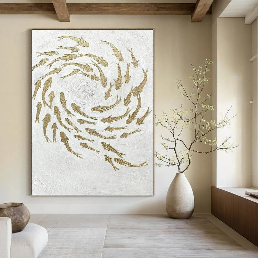 Inspired by the symbolism of fish in feng shui, the artist painted golden fish in a swirling pattern. Using a combination of stenciling and free - hand painting, they created a textured, eye - catching design. Perfect for a feng shui - themed home to bring good fortune or a luxury restaurant to add a touch of opulence.Handmade Acrylic/oil painting on canvas, Unframed/Not stretched. Packing: Rolled and shipped in a solid tube. The painting come with EXTRA 2-3 inch white border around for stretching or framing. Delivery time: You will receive the painting around 7-12 days( 3-5 days to finish the painting, 5-7 days to your home.by Fedex And Dhl)