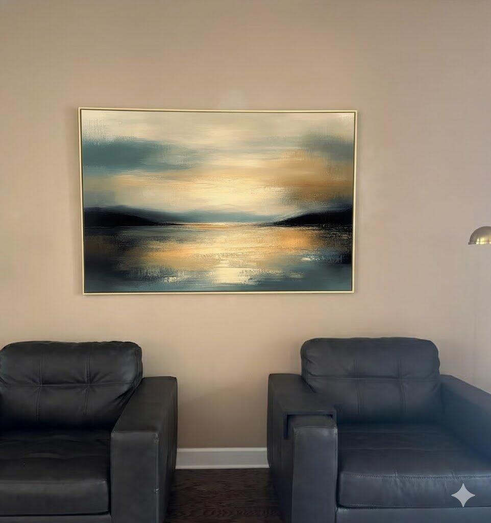 Captivated by the warmth of a lake sunset, the artist blended soft golds, blues, and grays. They built up layers to create depth, with the golden hues reflecting on the lake’s surface. It evokes a sense of luxury and tranquility, ideal for a lakeside villa to showcase the natural beauty or a luxury living room to add an elegant, warm touch.Handmade Acrylic/oil painting on canvas, Unframed/Not stretched. Packing: Rolled and shipped in a solid tube. The painting come with EXTRA 2-3 inch white border around for stretching or framing. Delivery time: You will receive the painting around 7-12 days( 3-5 days to finish the painting, 5-7 days to your home.by Fedex And Dhl)