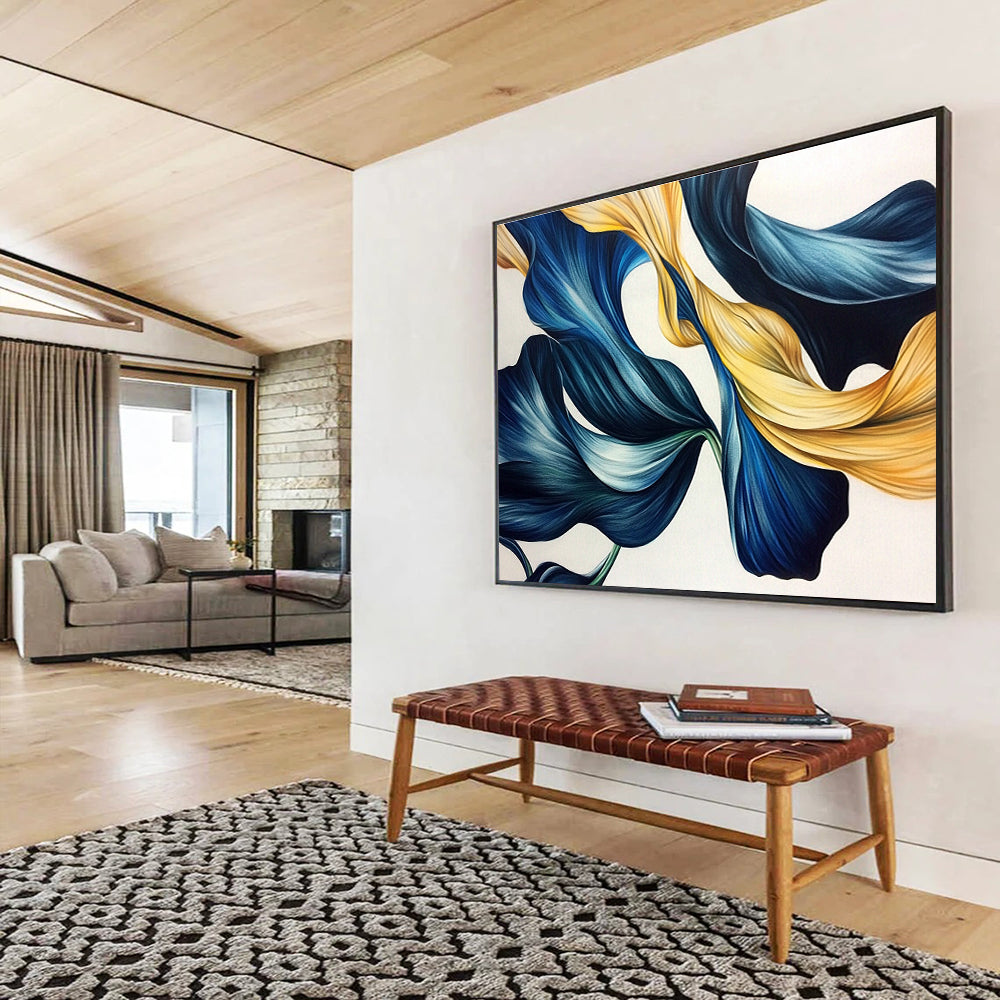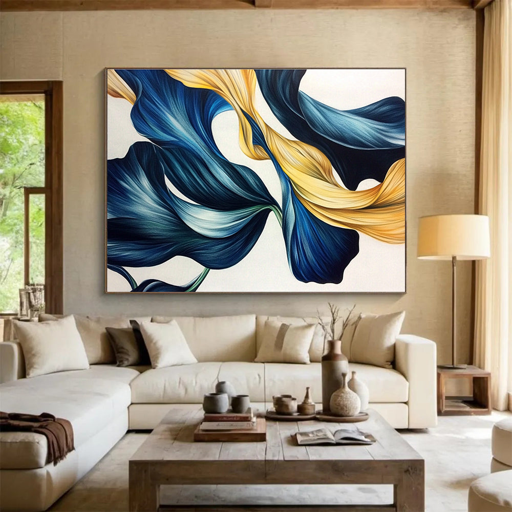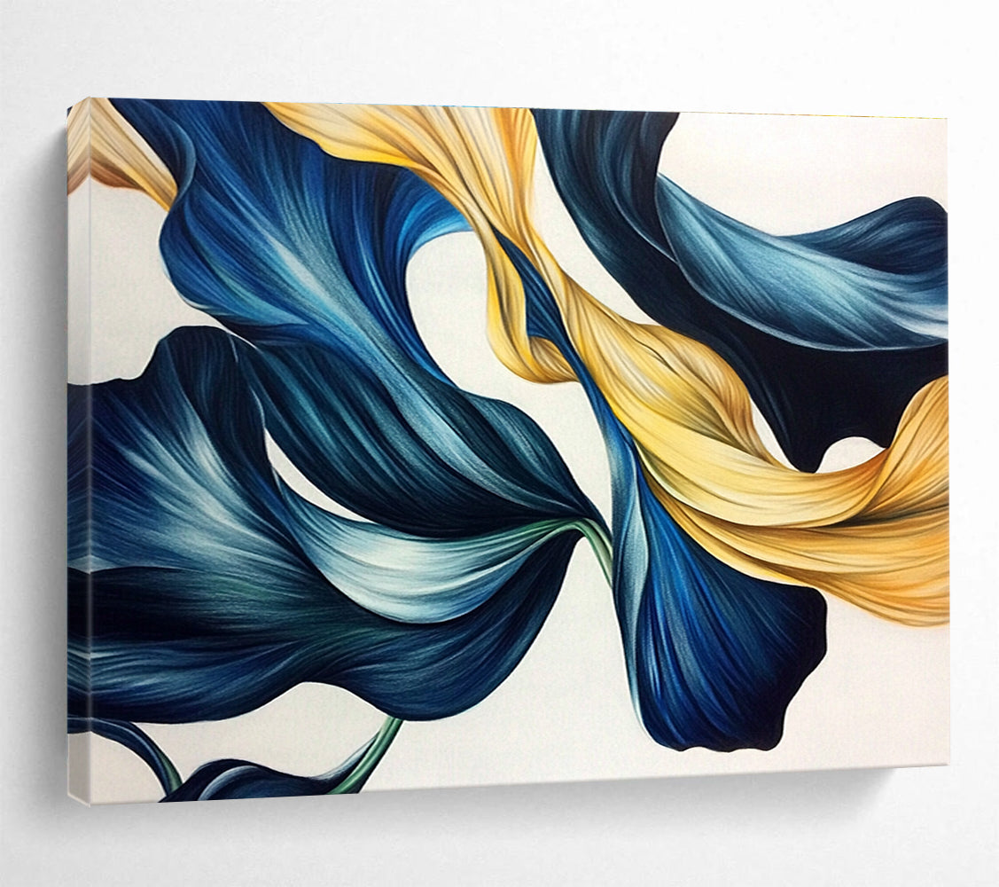Enchanted by flower movement, the artist painted smooth, undulating petals in blue and yellow. Focusing on gradient shading, they achieved a sleek, elegant look. Perfect for a modern bedroom’s minimalist decor or a luxury boutique dressing room to add a touch of refined beauty.Handmade Acrylic/oil painting on canvas, Unframed/Not stretched. Packing: Rolled and shipped in a solid tube. The painting come with EXTRA 2-3 inch white border around for stretching or framing. Delivery time: You will receive the painting around 7-12 days( 3-5 days to finish the painting, 5-7 days to your home.by Fedex And Dhl)
