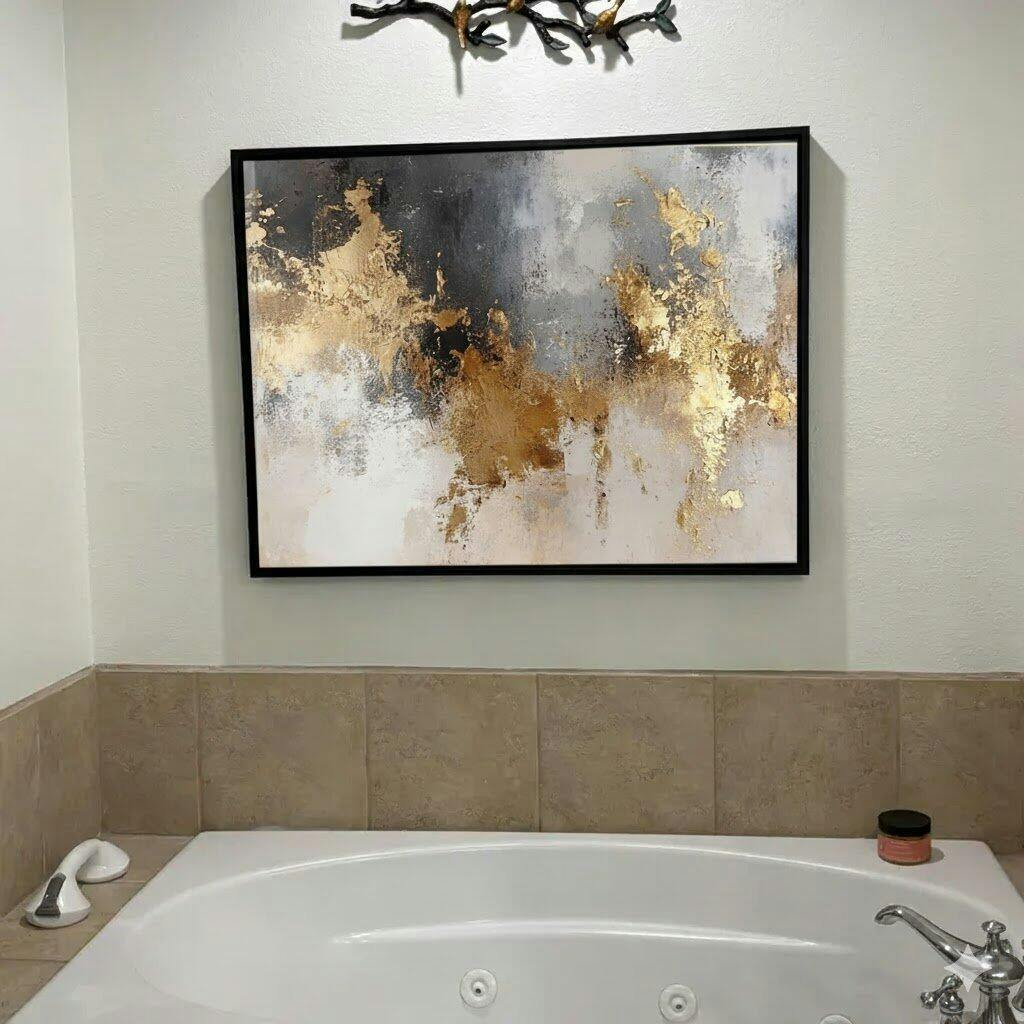 The artist uses a palette of gray and gold, with bold brushstrokes and textured layers. It represents luxury and sophistication, inspired by urban elegance. Each gold stroke adds a touch of opulence. Ideal for a luxury hotel lobby to impress guests or a modern office to add a sense of prestige.Handmade Acrylic/oil painting on canvas, Unframed/Not stretched. Packing: Rolled and shipped in a solid tube. The painting come with EXTRA 2-3 inch white border around for stretching or framing. Delivery time: You will receive the painting around 7-12 days( 3-5 days to finish the painting, 5-7 days to your home.by Fedex And Dhl)