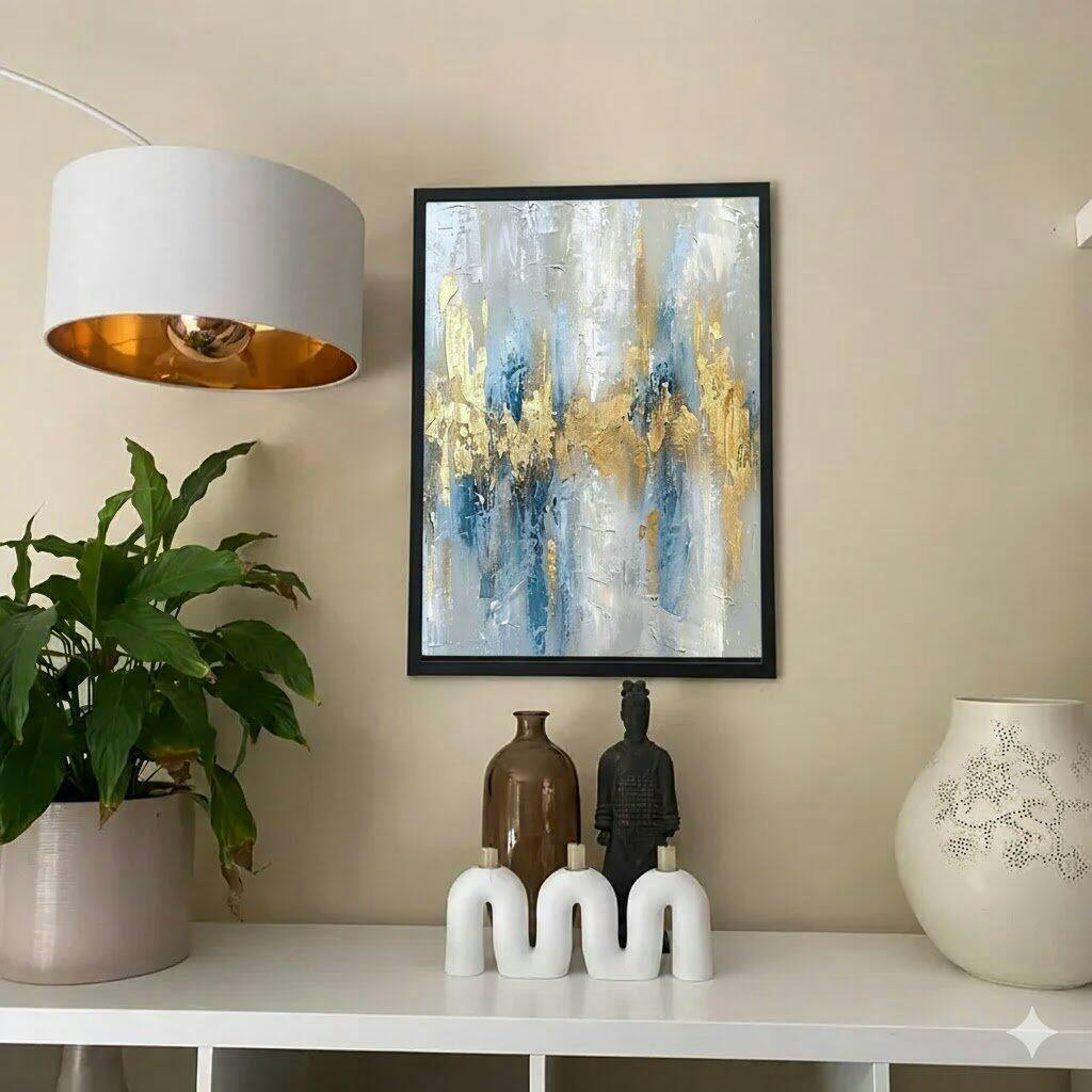 Capture the majesty of mountain landscapes with this gray - white - blue - gold abstract art. In a mountain chalet, with its rustic charm and stunning mountain views, it adds an artistic interpretation of the natural surroundings. The grays and whites represent the rocky peaks, the blues symbolize the sky and streams, and the golds hint at the sunlight filtering through the trees, creating a warm and inviting atmosphere in common areas or bedrooms. In a contemporary hotel suite, it elevates the guest experience with a touch of artistic luxury. The abstract forms and rich color palette make the suite feel unique and sophisticated, perfect for travelers seeking a memorable stay. Whether in a chalet to celebrate mountain living or in a hotel to impress guests, this art brings the beauty of the mountains to life.Handmade Acrylic/oil painting on canvas, Unframed/Not stretched. Packing: Rolled and shipped in a solid tube. The painting come with EXTRA 2-3 inch white border around for stretching or framing. Delivery time: You will receive the painting around 7-12 days( 3-5 days to finish the painting, 5-7 days to your home.by Fedex And Dhl)