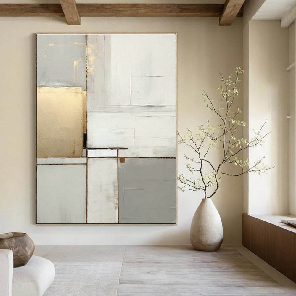 The gray - white base is calm, and the gold blocks add a touch of style, simple yet exquisite. In the office, it enhances the professional texture of the space, and during business negotiations, it conveys high - end taste. Placed in the luxury home living room, matching the luxurious furniture, art becomes the footnote of identity and aesthetics, and every inch of color shows extraordinary charm.Handmade Acrylic/oil painting on canvas, Unframed/Not stretched. Packing: Rolled and shipped in a solid tube. The painting come with EXTRA 2-3 inch white border around for stretching or framing. Delivery time: You will receive the painting around 7-12 days( 3-5 days to finish the painting, 5-7 days to your home.by Fedex And Dhl)