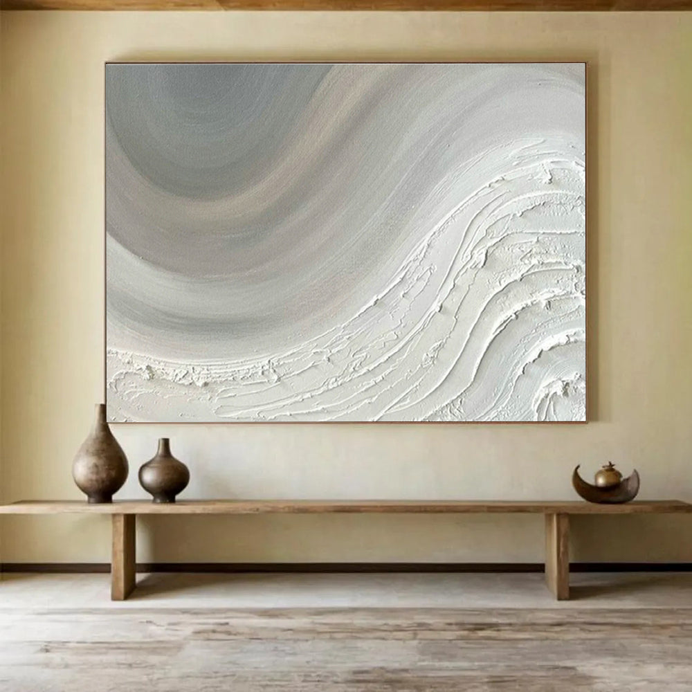 Smooth gray - white waves and a textured surface create a calm, focused workspace. Ideal for a minimalist home office, it eliminates distractions, allowing you to work in a serene, artistically understated environment.Handmade Acrylic/oil painting on canvas, Unframed/Not stretched. Packing: Rolled and shipped in a solid tube. The painting come with EXTRA 2-3 inch white border around for stretching or framing. Delivery time: You will receive the painting around 7-12 days( 3-5 days to finish the painting, 5-7 days to your home.by Fedex And Dhl)