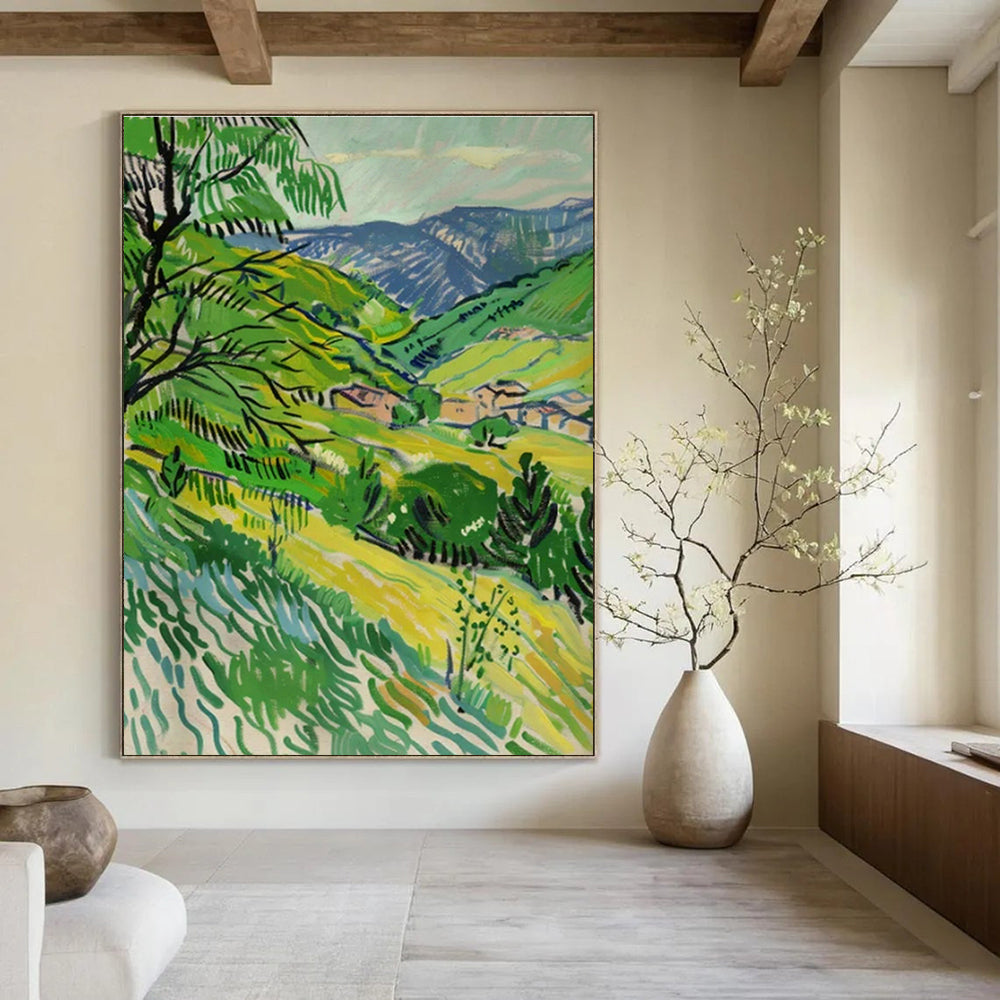 Lush green valleys, rolling hills, and a sense of outdoor tranquility. In an eco - friendly home with sustainable materials, energy - efficient design, and a love for nature, it complements the values of the household. The artwork brings the beauty of the outdoors inside, reminding residents of the importance of preserving natural landscapes. It can be a focal point in a living room with recycled wood furniture, organic cotton curtains, and a commitment to eco - consciousness. In an outdoor adventure company office where the focus is on hiking, camping, and exploring nature, it sets the tone. Employees can look at the painting and be inspired by the great outdoors, using it as a reminder of the adventures they help customers embark on. It can also spark ideas for new outdoor trips, marketing campaigns centered around nature, and a commitment to environmental stewardship.Handmade Acrylic/oil painting on canvas, Unframed/Not stretched. Packing: Rolled and shipped in a solid tube. The painting come with EXTRA 2-3 inch white border around for stretching or framing. Delivery time: You will receive the painting around 7-12 days( 3-5 days to finish the painting, 5-7 days to your home.by Fedex And Dhl)
