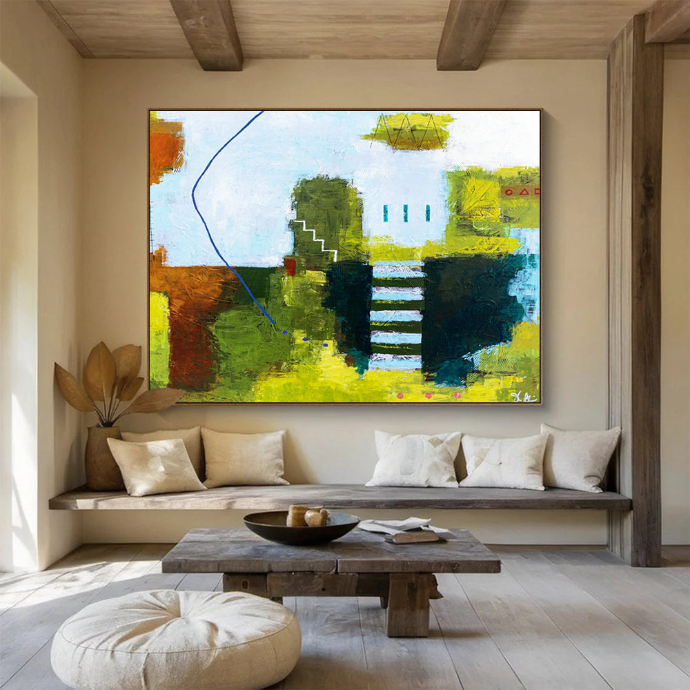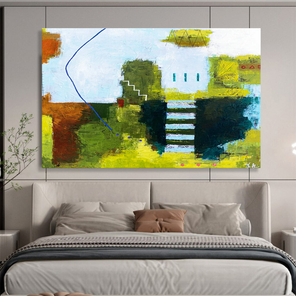 Impress clients in your real estate office with this green - yellow architectural abstract art. Subtle building motifs, earthy tones, and artistic lines evoke a sense of modern living. Perfect for showcasing properties, it turns your office into a visually appealing, professionally artistic space.Handmade Acrylic/oil painting on canvas, Unframed/Not stretched. Packing: Rolled and shipped in a solid tube. The painting come with EXTRA 2-3 inch white border around for stretching or framing. Delivery time: You will receive the painting around 7-12 days( 3-5 days to finish the painting, 5-7 days to your home.by Fedex And Dhl)