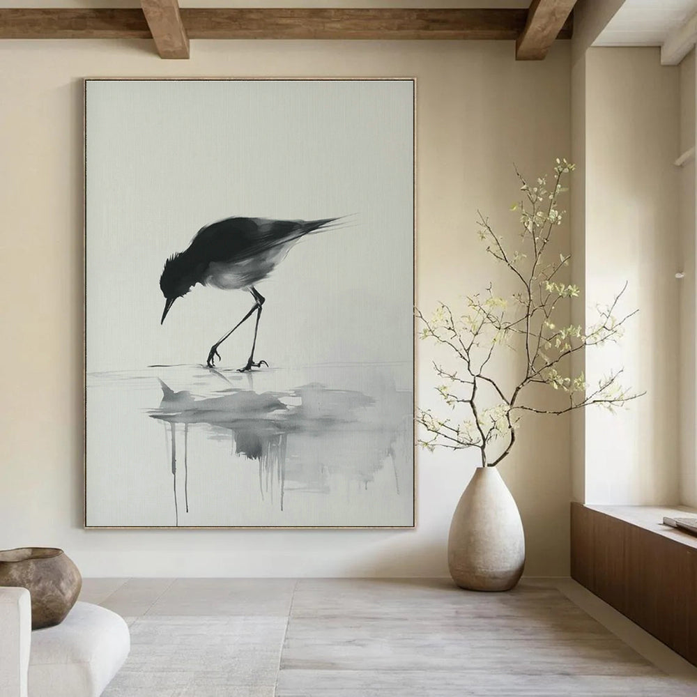 This ink - wash bird art exudes tranquility and elegance. In a Zen - inspired home, with its minimalist aesthetic and focus on peace, it creates a serene corner. The bird’s reflection and the gentle ink drips evoke a sense of calm, perfect for meditation or relaxation areas. Pair it with bamboo plants and tatami mats to enhance the Zen vibe. In a traditional tea house, it fits seamlessly into the cultural ambiance. As patrons enjoy tea, the art invites contemplation of nature’s beauty, reflecting the tea - drinking philosophy of mindfulness. It complements wooden tea sets and calligraphy decor, adding an artistic touch to the tea - tasting experience. Whether in a home for inner peace or in a tea house for cultural immersion, this art brings a whisper of nature’s serenity.Handmade Acrylic/oil painting on canvas, Unframed/Not stretched. Packing: Rolled and shipped in a solid tube. The painting come with EXTRA 2-3 inch white border around for stretching or framing. Delivery time: You will receive the painting around 7-12 days( 3-5 days to finish the painting, 5-7 days to your home.by Fedex And Dhl)