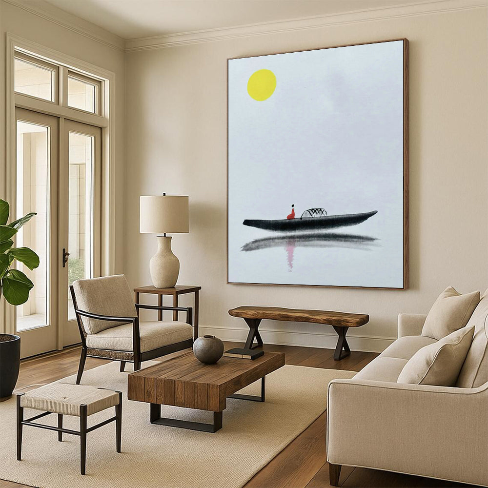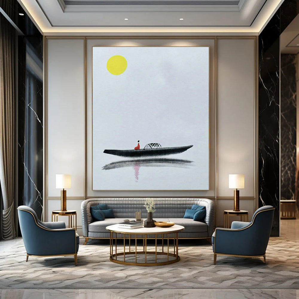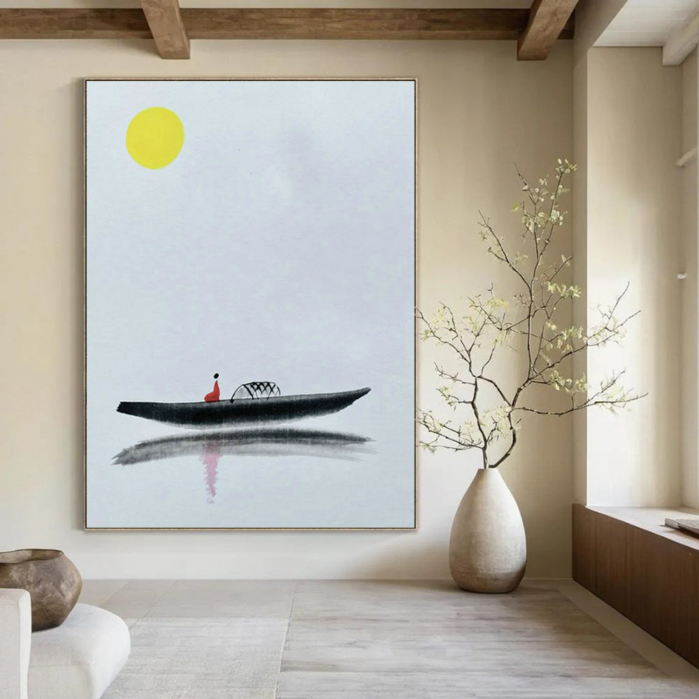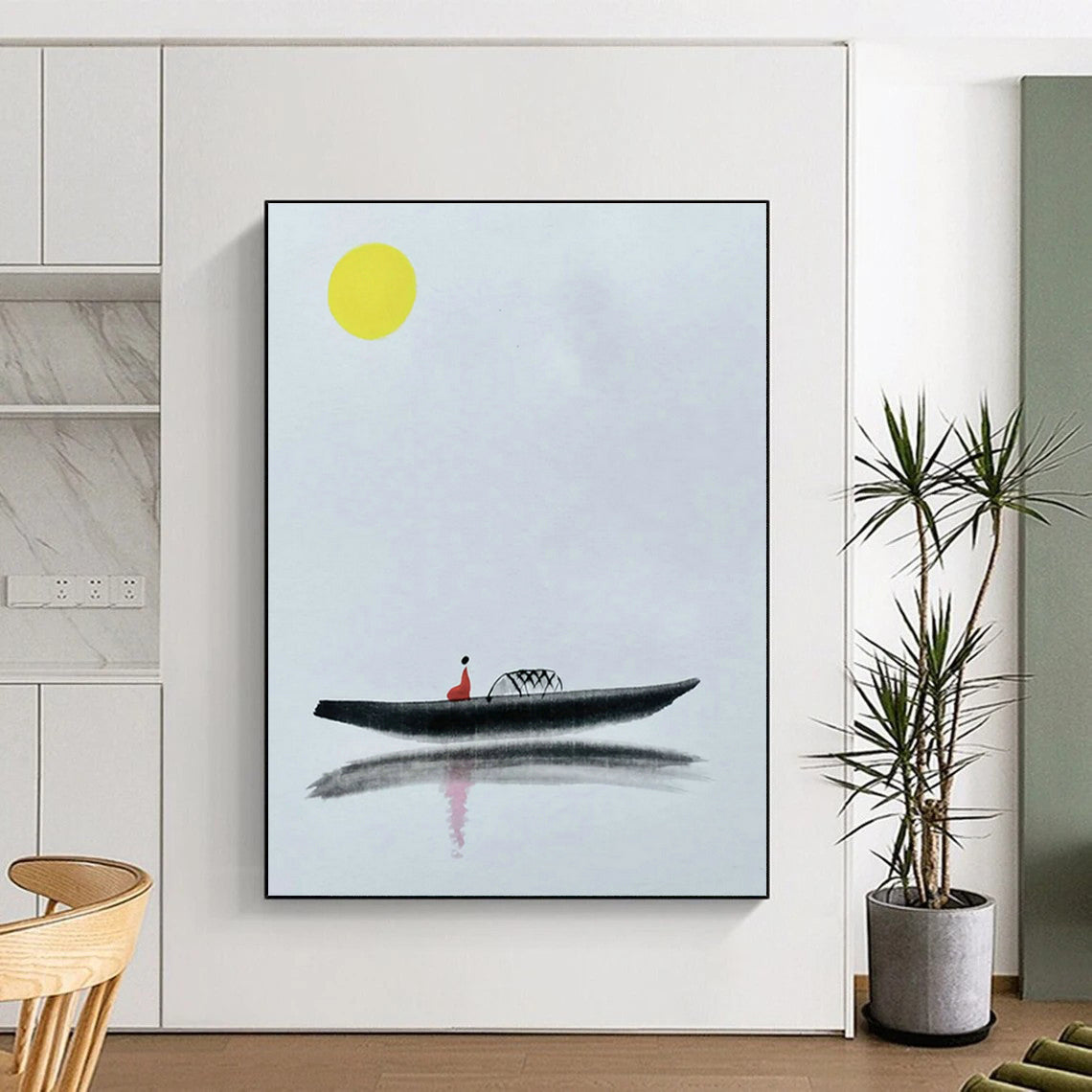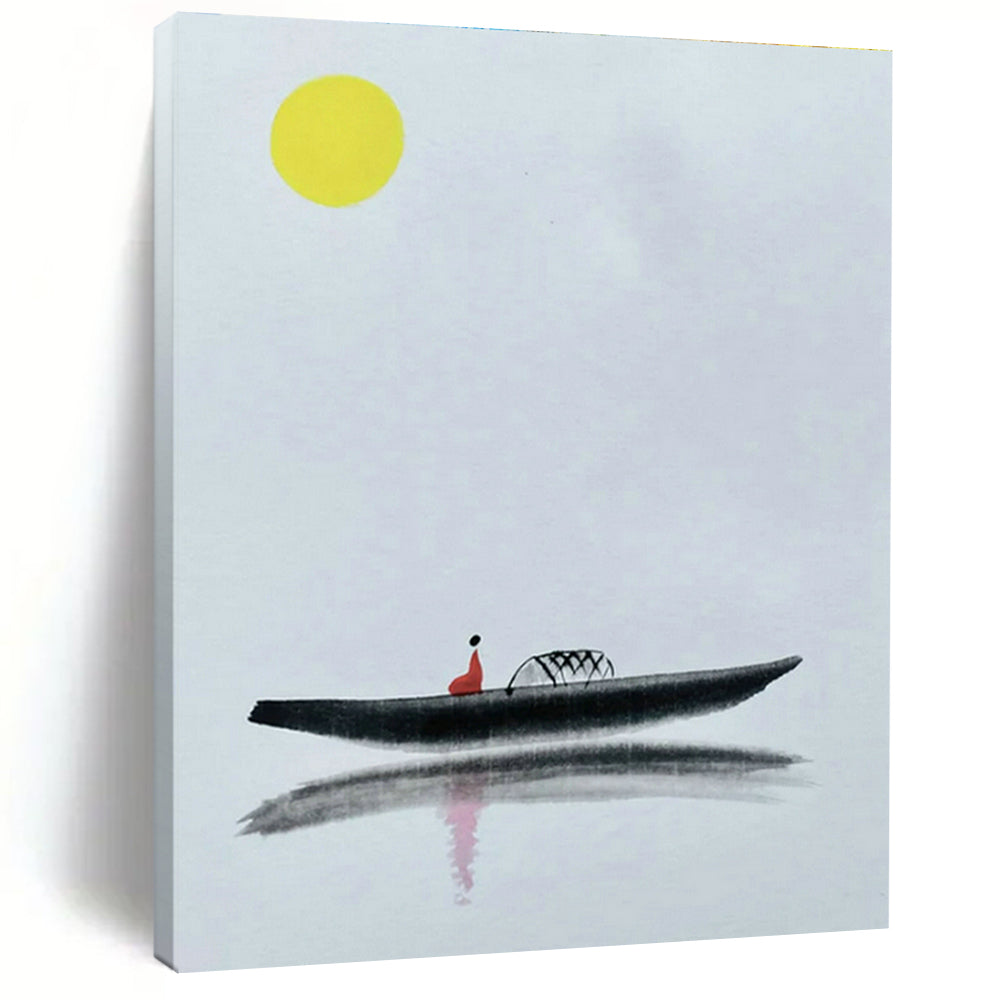 This ink - wash boat art, with its minimalist and tranquil design, embodies the essence of Asian art and philosophy. In an Asian - inspired restaurant with traditional decor and a focus on authentic cuisine, it adds an artistic touch. The artwork's simplicity and elegance complement the restaurant's ambiance, creating a harmonious dining experience. It can be displayed in the dining area or near the entrance, welcoming guests with its serene beauty. In a Zen garden pavilion where people go to find peace and solitude, it enhances the meditative environment. The ink - wash technique and the image of a boat floating on water symbolize tranquility and the journey of life, aligning with the principles of Zen. It creates a space for contemplation and reflection, allowing visitors to connect with nature and their inner selves.Handmade Acrylic/oil painting on canvas, Unframed/Not stretched. Packing: Rolled and shipped in a solid tube. The painting come with EXTRA 2-3 inch white border around for stretching or framing. Delivery time: You will receive the painting around 7-12 days( 3-5 days to finish the painting, 5-7 days to your home.by Fedex And Dhl)