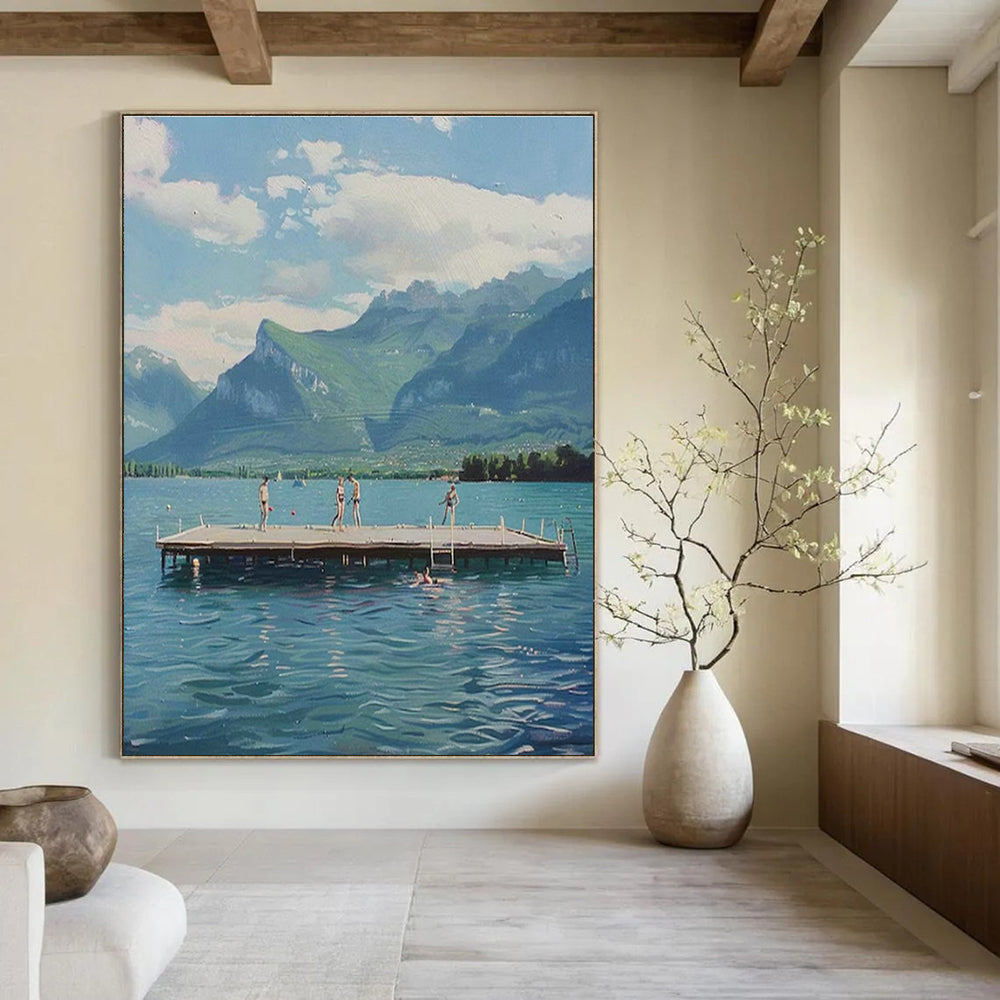 A serene depiction of a lakeside escape—clear blue water, majestic mountains, and people enjoying the outdoors. In a lakehouse retreat, it’s the perfect addition. Hang it in the living area, and guests will feel instantly transported to the peaceful lakeshore, the painting enhancing the retreat’s relaxing, nature - centered vibe. For a nature - lover’s living room, filled with potted plants and earth - tone furniture, this art brings the outside in. It serves as a constant reminder of the beauty of the natural world, turning the living room into a cozy haven for daydreaming about outdoor adventures.Handmade Acrylic/oil painting on canvas, Unframed/Not stretched. Packing: Rolled and shipped in a solid tube. The painting come with EXTRA 2-3 inch white border around for stretching or framing. Delivery time: You will receive the painting around 7-12 days( 3-5 days to finish the painting, 5-7 days to your home.by Fedex And Dhl)