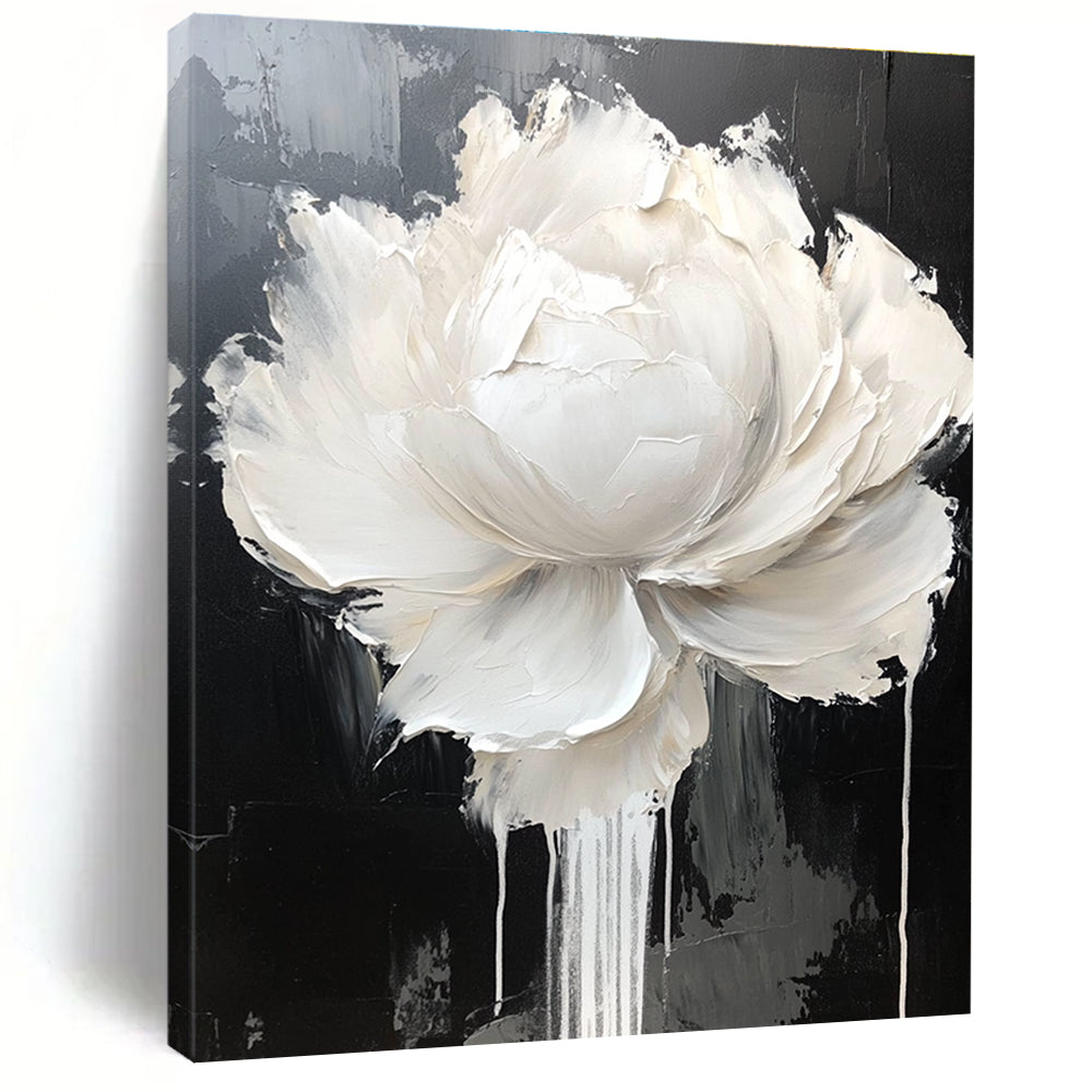 Enchanted by luxury and contrast, the artist painted a large, textured white flower on a black background. The gold drips add opulence. Perfect for a luxury dining room to create an elegant, sophisticated ambiance or a high - end art showroom to showcase exclusive, luxurious art.Handmade Acrylic/oil painting on canvas, Unframed/Not stretched. Packing: Rolled and shipped in a solid tube. The painting come with EXTRA 2-3 inch white border around for stretching or framing. Delivery time: You will receive the painting around 7-12 days( 3-5 days to finish the painting, 5-7 days to your home.by Fedex And Dhl)