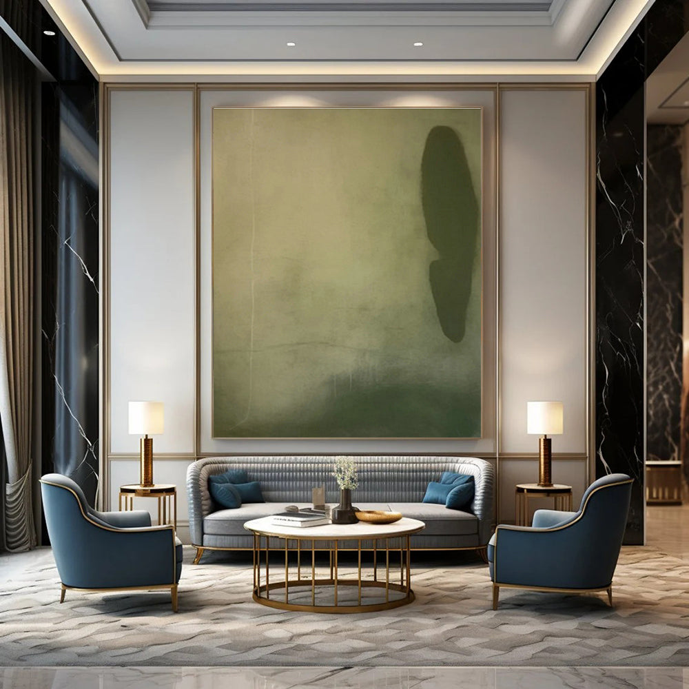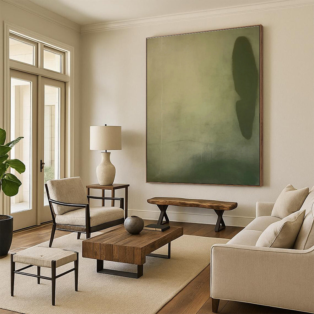 Subtle dark green shapes on a muted background evoke tranquility. In a Japandi - style study (blending Japanese simplicity and Scandinavian warmth), it pairs with wooden desks and woven rugs—perfect for focused work or mindful reading. In a calm yoga studio, its understated energy complements meditation corners. The soft gradients and clean lines guide the eye to rest, ideal for spaces prioritizing peace.Handmade Acrylic/oil painting on canvas, Unframed/Not stretched. Packing: Rolled and shipped in a solid tube. The painting come with EXTRA 2-3 inch white border around for stretching or framing. Delivery time: You will receive the painting around 7-12 days( 3-5 days to finish the painting, 5-7 days to your home.by Fedex And Dhl)